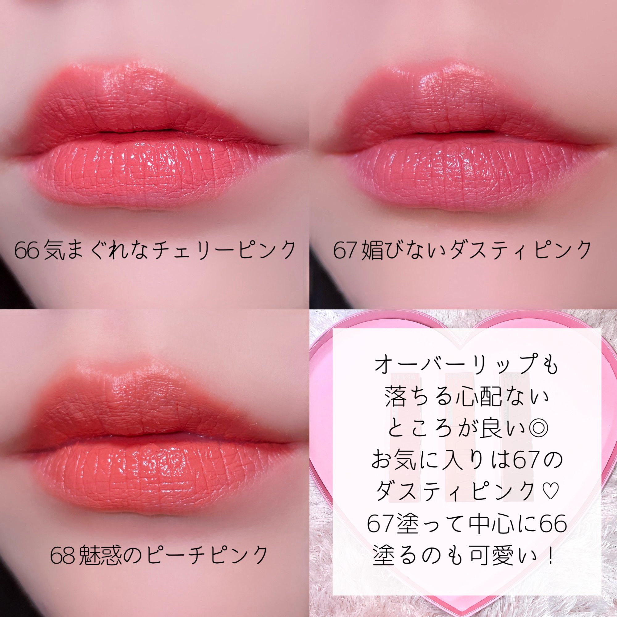 ティッシュオフしてもこすってもツヤ感が消えないのがすごい✨ 青みと黄みの絶妙バランスでどんな肌トーンでも使いやすいピンクカラーが登場💓 飲んだり食べたりしても長時間かわいい唇をキープできるのはうれしいっ👍🏻