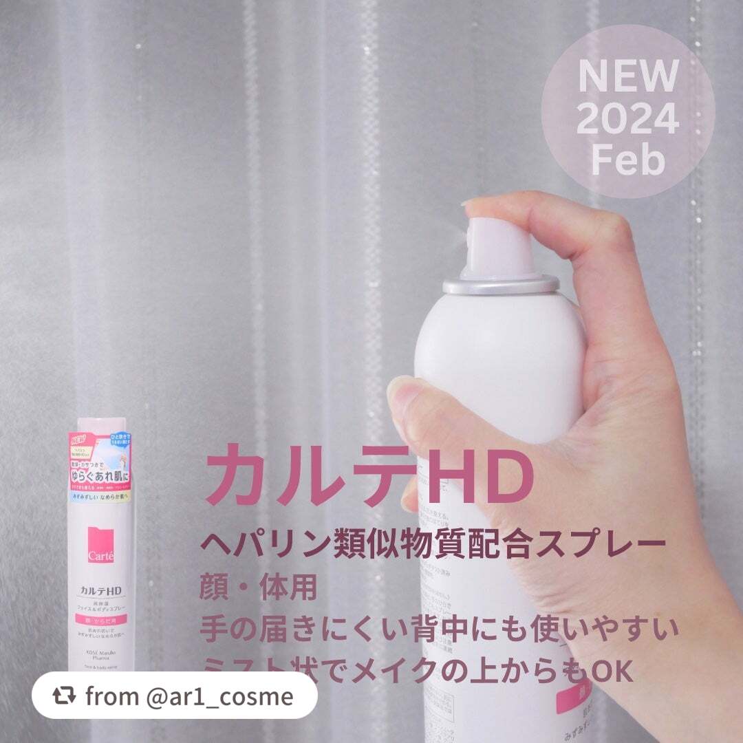 - 【全身用高保湿スプレー】 コーセーとマルホの合弁会社コーセーマルホファーマから発売された「カルテHD」。 エアゾールタイプの化粧水としては「初めて※1」ヘパリン類似物質HD※2を配合した全身用スプレー化粧水です。 配合のヘパリン類似物質HDはマルホから唯一供給を受けた「ヘパリン類似物質HD」を配合。 しっとり感とみずみずしさを叶える極上のミストが、すばやく広がり、全身をみずみずしいうるおいでふわっと包みます。 しっとりうるおうのにべたつかない軽やかな使い心地で、いつでもどこでも手軽な高保湿ケアを実現。 24時間乾燥の隙なし習慣を叶えます。 毎日のお顔のお手入れはもちろん、手の届きにくい背中などのボディケアや 子どもの全身保湿・男性のスキンケアなど幅広い場面で活躍。 うるおい構造(角層ラメラ)を整えて、あれにくい肌にみちびきます。 <販売名:HDフェイスボディSP> ※1 コーセーグループ商品として ※2 保水有効成分ヘパリン類似物質のこと