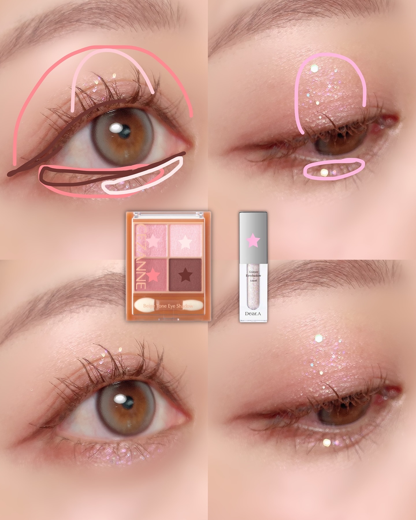 まろやかでほんのり甘い白桃ベージュ🍑 全体的な配色はかなりニュートラルですが、左下のラメが少し青みを感じるピンク&シルバーなので、1番はブルベ夏の方におすすめしたいなぁという印象。 この4色が揃っているおかげで、アイメイクが簡単に仕上がります!左下のマットピンクは眉に入れるとアイメイクとの統一感も出せます✨