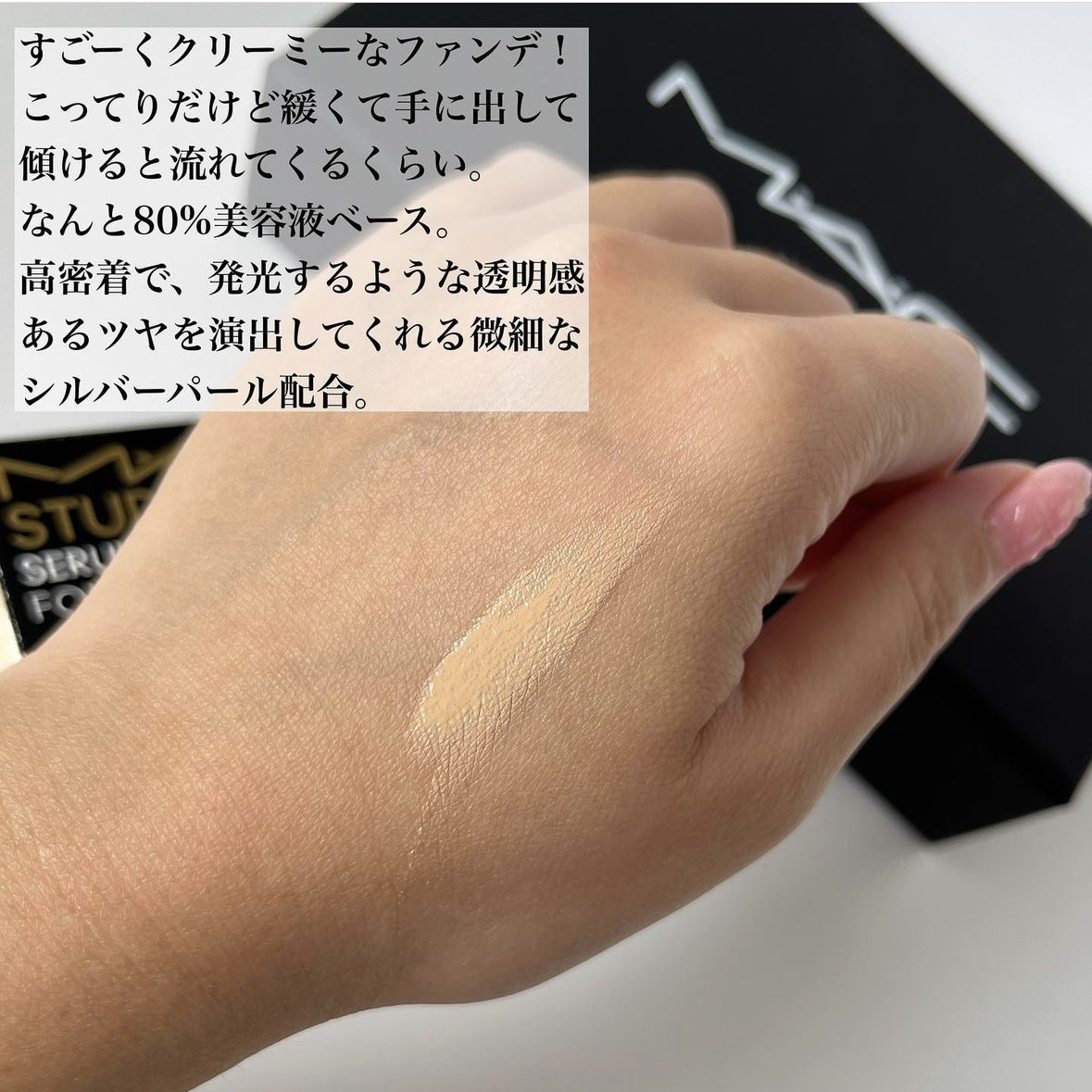 - ■素肌から発光するようなつや。80%美容液ベース。 M·A·Cアーティストが作り出すような、透明感ある仕上がり。つや肌12時間続く 肌の悩みをカバーするためのファンデーションから、美しい肌を魅せるためのファンデーションへ。 80%美容液ベース*1、 33種のスキンケア成分*1 配合のなめらかなテクスチャーで、肌に潤いと透明感をもたらすことで、まるで素肌から発光するような、透明感のあるつや肌へ仕上げます。 つけたての透明感ある仕上がり。フレッシュなツヤ感のある仕上がりが12時間*3続きます。 33種のスキンケア成分、主な成分: ヒアルロン酸Na(保湿成分)、ホホバ種子油 (保湿成分)、オリーブ油 (保湿成分)、ヒマワリ種子エキス (保湿成分)、オオムギ種子エキス (保湿成分)、キュウリ果実エキス (保湿成分) *1 美容液ベース及びスキンケア成分とは、着色剤、製品の防腐剤や安定剤を除く、水や保湿成分、皮膚コンディショニング成分のこと *2 化粧もち(色落ち)データ取得済み (当社調べ。効果には個人差があります)