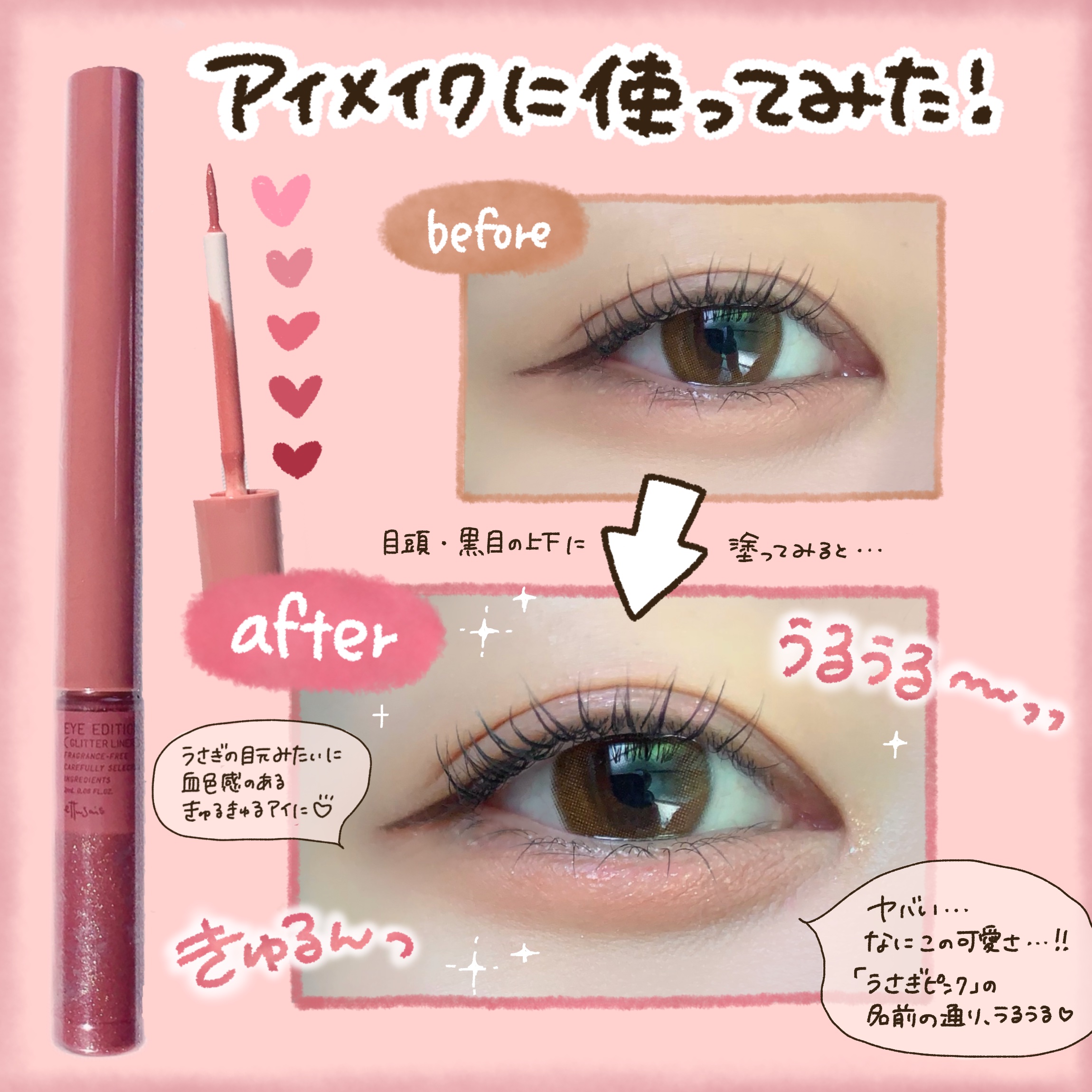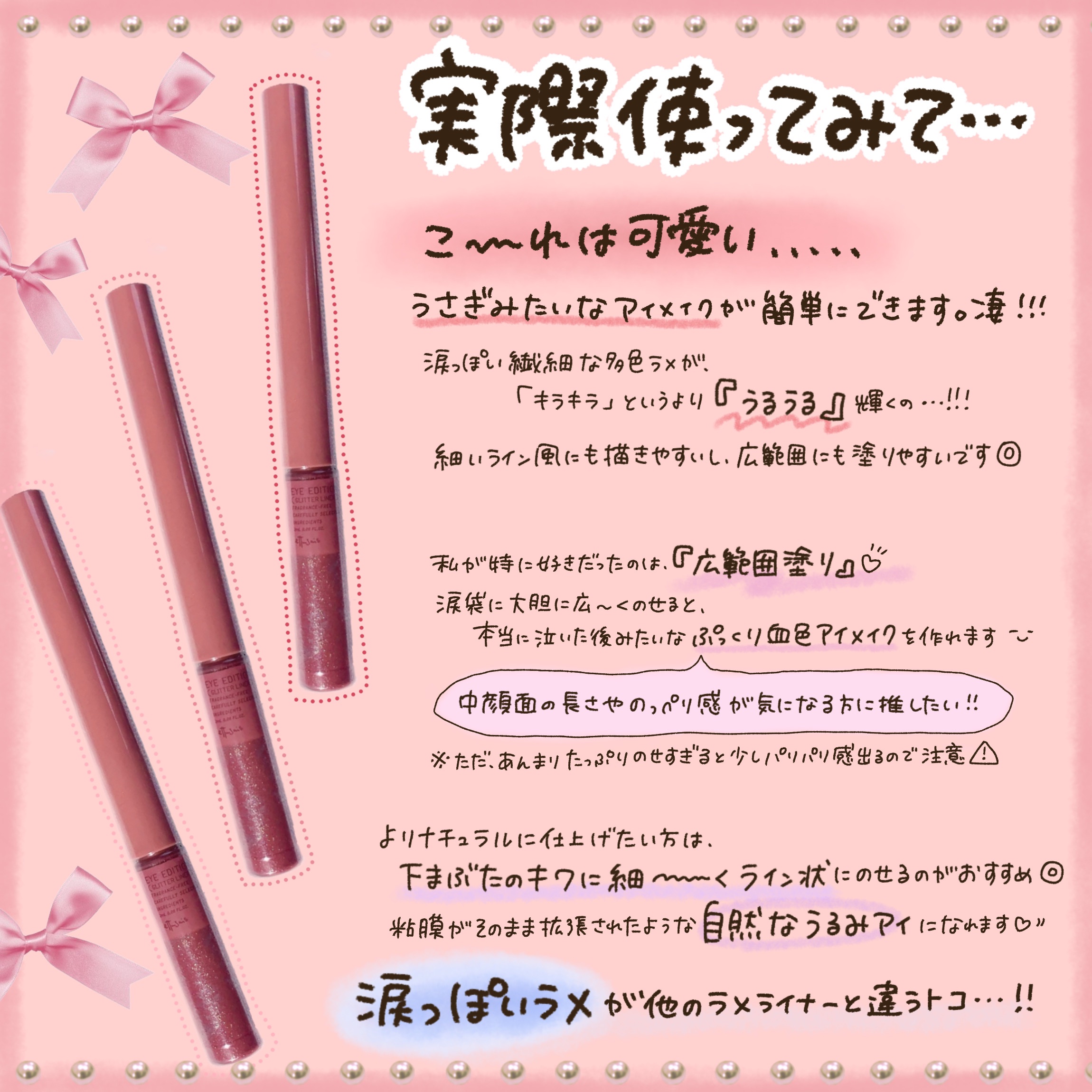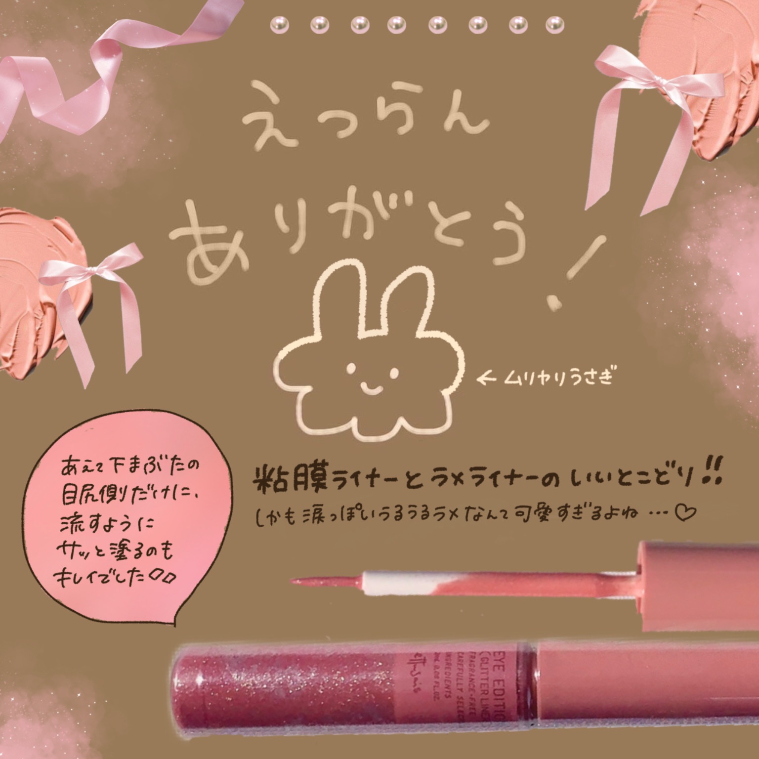 めちゃくちゃうるうるで盛れる!というよりは結構馴染みがいいかんじかな? 色味がピンクというより粘膜の赤って感じなので 色自体が馴染みいいのもあるし、ラメ自体も細かいので なんとなくの赤みとツヤっぽさが足される、と言ったところだろうか… 私自身は涙袋をもっとギラつかせたいタイプの人間なので 正直物足りない😂😂😂 いっそ赤いグリッターとかあったら個性的で可愛いかも(?) ナチュラルなうさぎeyeにしたい方向けかと思います🥹