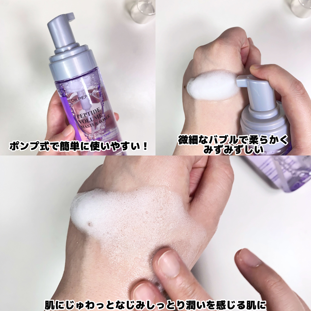 トナーなのに泡がでてくるー(ฅ>ω<ฅ)♡ ドクターペプチ様のペプチドボリュームマスタートナーは、見えてるのは透明しゃばしゃばちゃんなのにポンプをプッシュするとなんと泡っ❣❣ 特化成分配合で肌のハリ改善に効果的 ドクターペプチーの独自成分であるスキンリフティングプロ、低分子コラーゲン、ペプチド12種を配合しており、肌のハリ改善に効果的 毛穴・ハリ・キメケアが一気にできちゃうバブルトナー(・ω・人)泡だから液垂れしないからテクスチャーよき◎
