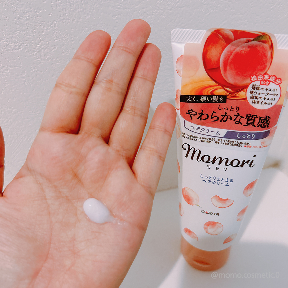 髪の毛が傷んでる人におすすめしたいヘアクリーム☝🏼 うるおい成分(モモ果実エキス・モモ果実水・モモ葉エキス)保護成分(モモ核油)保水成分(シロキクラゲエキス)毛髪修復成分(シアバター)配合 ヘアミルクなどよりもしっかりとしたクリームテクスチャーでベタつくかと思いましたがぜんぜんべたつきなどなく私の傷んだ髪の毛のごわつきなども落ち着きました。 ふんわりとした桃の香りも好きでした🥰 もう少し軽めの仕上がりが良いって人にはしっとりまとまるヘアクリームの方もおすすめ✨️