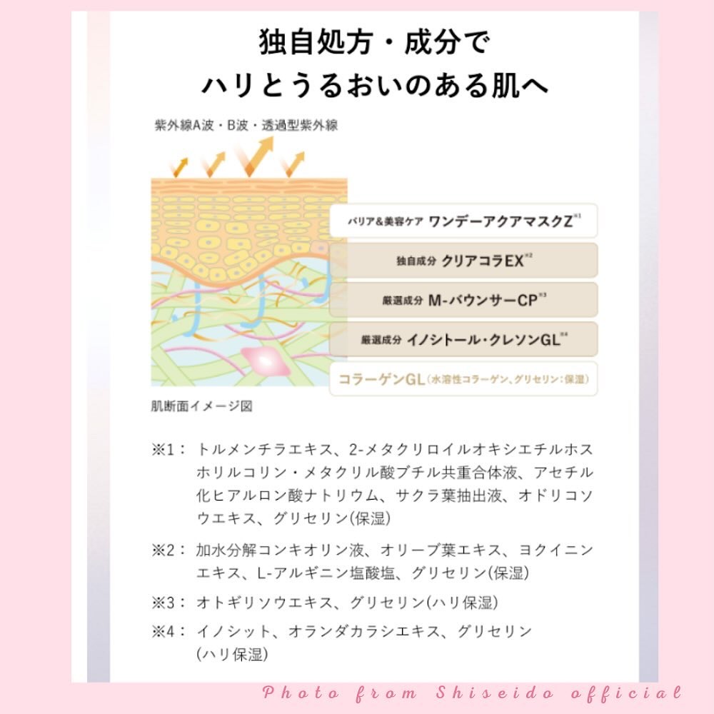- <35g> マイカ、シリカ、酸化亜鉛、水、酸化チタン、BG、グリセリン、ジメチコン、フェノキシエタノール、エチルヘキサン酸セチル、香料、トコフェロール、水酸化Al、チャ葉エキス、水溶性コラーゲン、酸化鉄、エタノール、ローズマリー葉油、メトキシケイヒ酸エチルヘキシル、トリエトキシカプリリルシラン、ポリクオタニウム-51、アセチルヒアルロン酸Na、加水分解コンキオリン、オランダガラシ葉/茎エキス、ビスPEG-18メチルエーテルジメチルシラン、マカデミアナッツ脂肪酸フィトステリル、オクトクリレン、ビスエチルヘキシルオキシフェノールメトキシフェニルトリアジン、セスキイソステアリン酸ソルビタン、ハトムギ種子エキス、トルメンチラ根エキス、BHT、サクシノグリカン、オドリコソウ花/葉/茎エキス、PEG-8、イノシトール、オリーブ葉エキス、テトラヒドロテトラメチルシクロテトラシロキサン、テトラデセン、アルギニンHCl、メリロートエキス、ジエチルアミノヒドロキシベンゾイル安息香酸ヘキシル、硫酸Ba、PEG/PPG-17/4ジメチルエーテル、サクラ葉エキス、(ジメチルアクリルアミド/アクリロイルジメチルタウリンNa)クロスポリマー、カプリリルメチコン、ポリブチレングリコール/PPG-9/1コポリマー、ポリシリコーン-15、ステアロキシヒドロキシプロピルメチルセルロース、オトギリソウ花/葉/茎エキス