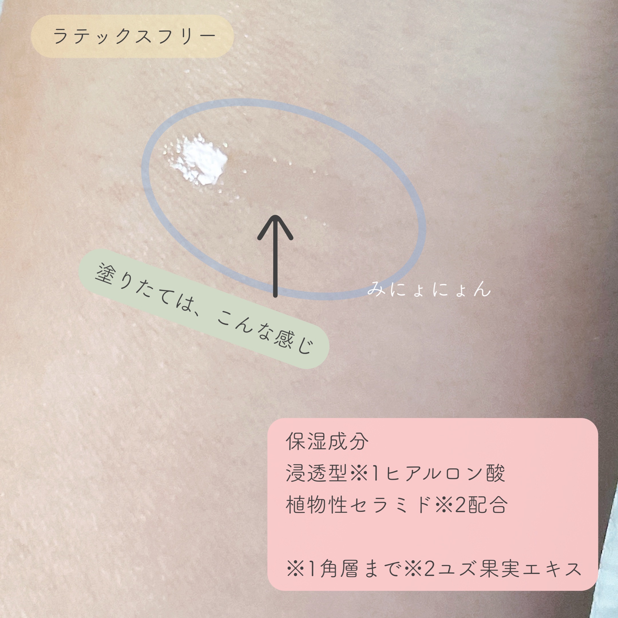 - 水、 エタノール、 (アクリル酸アルキル/ジアセトンアクリルアミド)コポリマーAMP、 BG、 グリチルリチン酸2K、 加水分解ヒアルロン酸、 ユズ果実エキス、 フェノキシエタノール