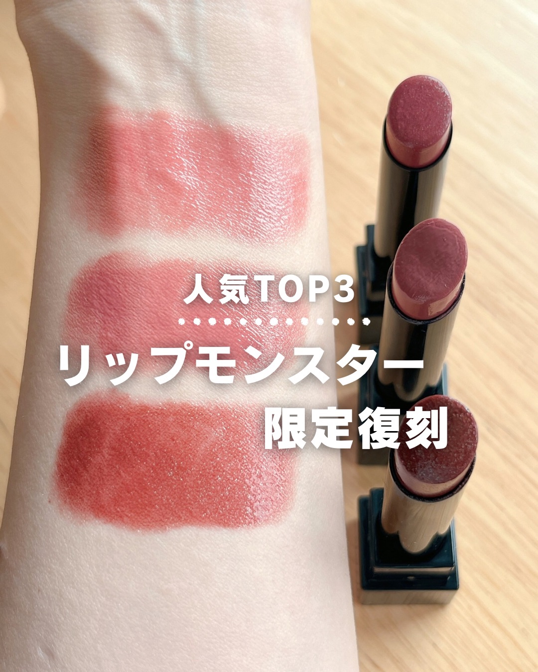 - 落ちにくさも美発色もよくばりたい、つけたての色が長時間持続する人気の口紅リップモンスター。 唇から蒸発する水分を活用して密着ジェル膜に変化する独自技術※で、つけたての色が長時間持続。 高発色&保湿。 ※当社独自の色持ち技術 ■花火のようにまぶしくきらめく 繊細なラメが際立つ限定色 EX-6 ピンクカラー×青ラメ【ロケット花火流星群】 EX-7 オレンジカラー×黄&緑ラメ【100万発の線香花火】 EX-8 レッドカラー×緑ラメ【打ち上げ花火ブランコ】 ■深みレッド系カラーの限定色 EX-9 戦慄の喜笑 (限定色) EX-10 狂気の怒号 (限定色) 【2025クリスマスコフレ】 落ちにくいリップモンスターから、唇の血色感を底上げする ホリデーシーズン限定の熱感ニュアンスベージュ系カラー登場。 EX-11 紅煙宿る贈り物(限定色):ボルドーベージュ系 EX-12 盗まれた1224mの星光(限定色):キャメルベージュ系