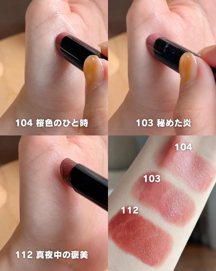 1位🥇104 桜色のひと時:やさしいグリーンパールを纏う、柔らかく深いオールドピンク 2位🥈103 秘めた炎:上品でシックなミルクティーブラウン 3位🥉112 真夜中の褒美:グリーンパールが光るレッドブラウン