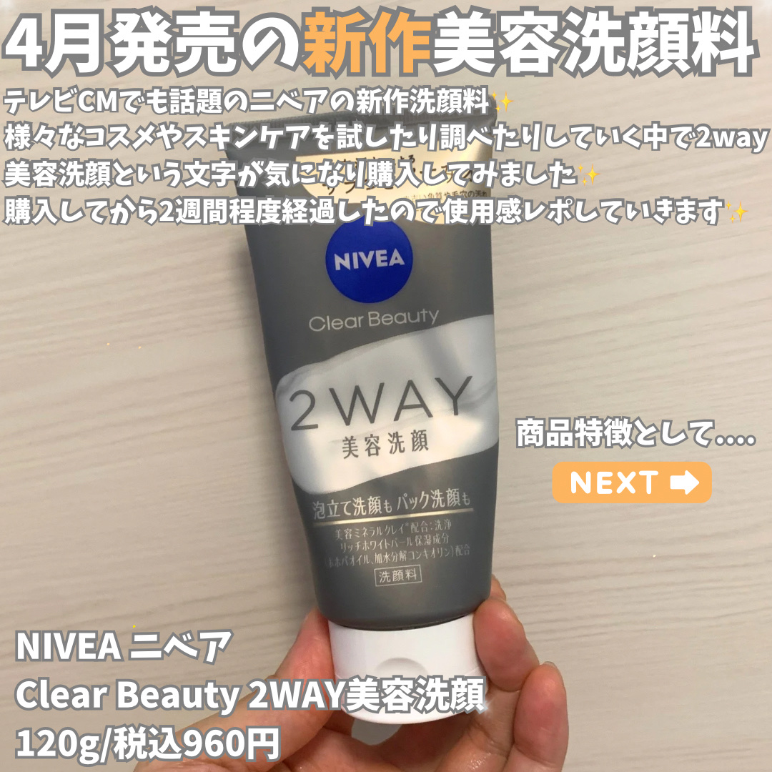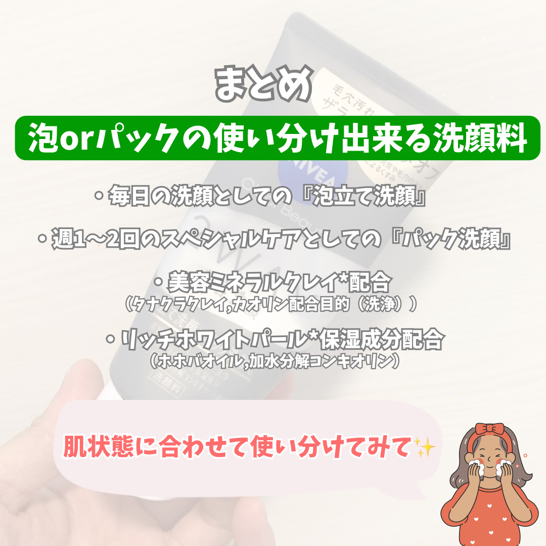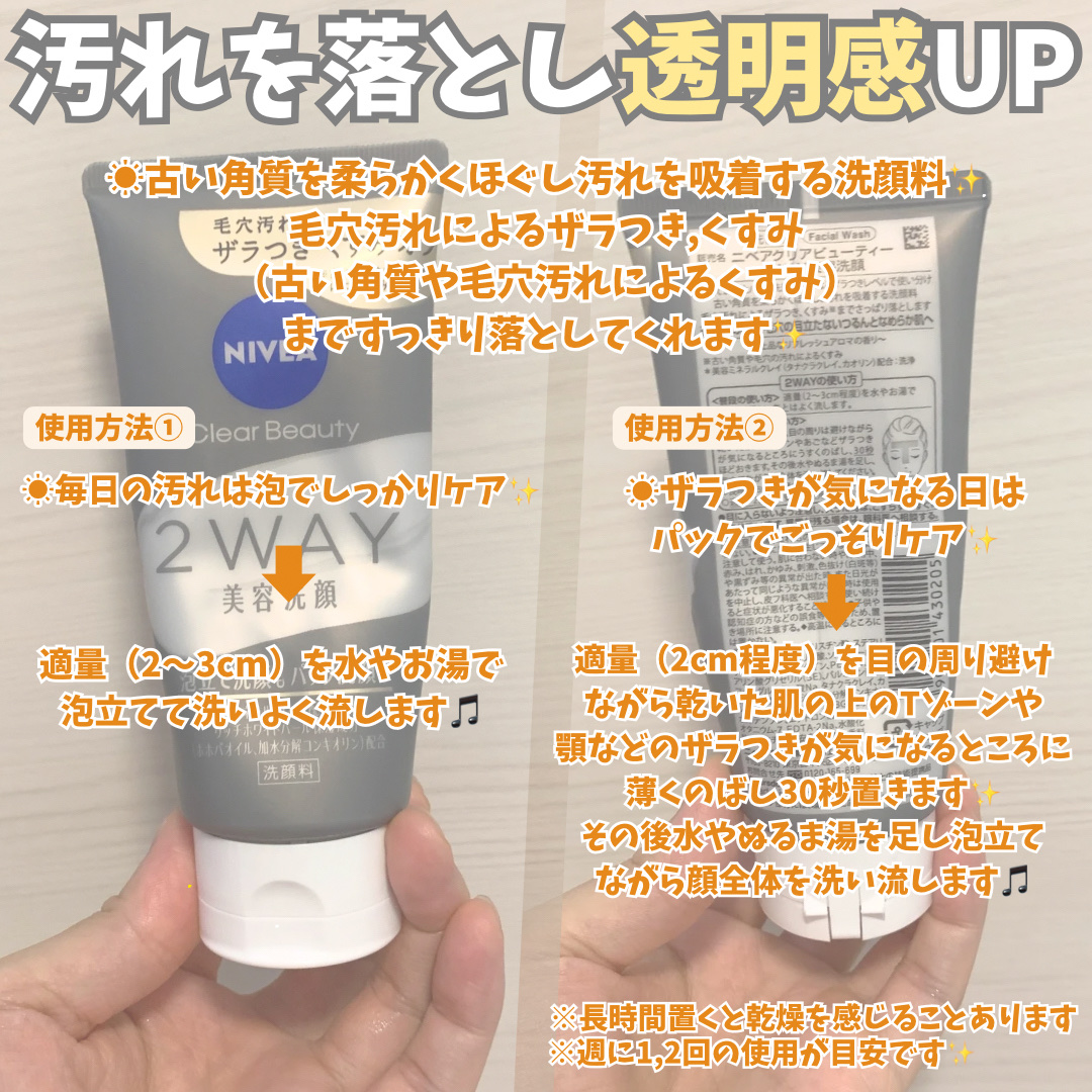 - ※商品名変更(旧名:ニベア クリアビューティー2WAY美容洗顔)に伴い、商品パッケージを順次リニューアル。尚、これにかかる商品の返品・交換は承っておりません。 気になるザラつきレベルに合わせて洗い分け。 毎日の汚れには泡でしっかり。 ザラつき気になる日はパックでごっそり。 古い角質を柔らかくほぐし、汚れを吸着する洗顔料。 毛穴汚れによるザラつき、くすみ*までさっぱり落とします。 透明感のある、毛穴の目立ちにくいつるんとなめらか肌へ。 ●美容ミネラルクレイ配合:タナクラクレイ、カオリン(洗浄) ●リッチホワイトパール保湿成分配合:ホホバオイル、加水分解コンキオリン *古い角質や毛穴の汚れによるくすみ