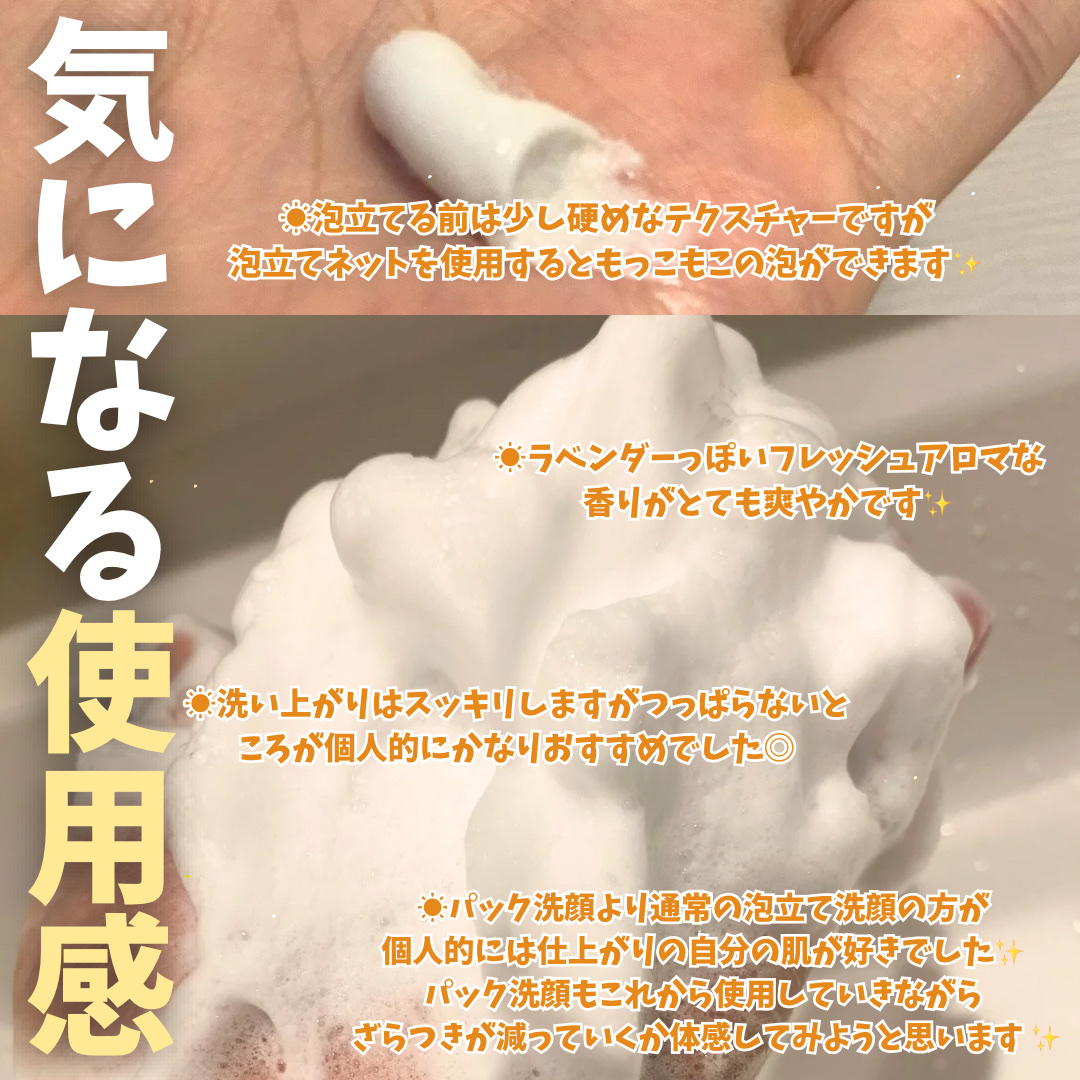 洗うたび、ザラつき・くすみのない肌へ。泡立て洗顔とパック洗顔ができる2WAYなので気になるザラつきレベルに合わせて使い分けできます。 毎日の汚れは泡でしっかり!美容ミネラルクレイ配合。泡立てネット使用でモコモコ濃密な泡立ちに🫧 洗い上がりはスッキリめでリフレッシュアロマのさっぱとしたいい香りです