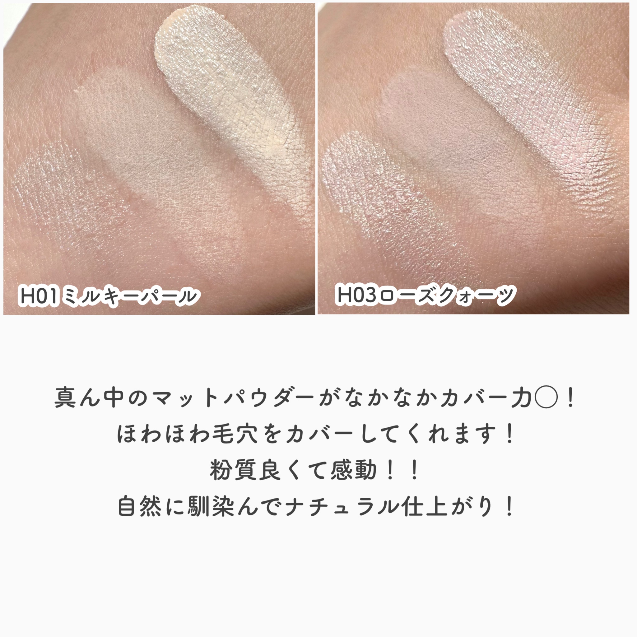 - <H01 ミルキーパール> 1#:酸化チタン、ヘキサ(ヒドロキシステアリン酸/ステアリン酸/ロジン酸)ジペンタエリスリチル、ダイマージリノール酸ジ(イソステアリル/フィトステリル)、(アクリレーツ/アクリル酸ステアリル/メタクリル酸ジメチコン)コポリマー、水添ポリ(C6-14オレフィン)、ダイマージリノール酸(フィトステリル/イソステアリル/セチル/ステアリル/ベヘニル)、トリ(カプリル酸/カプリン酸)グリセリル、ワセリン、テトライソステアリン酸ペンタエリスリチル、合成ワックス、マイクロクリスタリンワックス、(ビニルジメチコン/メチコンシルセスキオキサン)クロスポリマー、トリヒドロキシステアリン、ポリリシノレイン酸ポリグリセリル-6、カオリン、セスキオレイン酸ソルビタン、パラフィン、アルキル(C30-45)メチコン、合成フルオロフロゴパイト、オレフィン(C30-45)、ジステアルジモニウムヘクトライト、酸化鉄、水酸化Al、炭酸プロピレン、香料、デヒドロ酢酸、ジステアリルジモニウムクロリド、酢酸トコフェロール 2#:タルク、マイカ、(フッ化/水酸化/酸化)/(Mg/K/ケイ素)、シリカ、酸化チタン、ポリプロピレン、アルミナ、(ジフェニルジメチコン/ビニルジフェニルジメチコン/シルセスキオキサン)クロスポリマー、スクワラン、水添ポリデセン、パルミチン酸エチルヘキシル、ヘキサ(ヒドロキシステアリン酸/ステアリン酸/ロジン酸)ジペンタエリスリチル、リンゴ酸ジイソステアリル、ミリスチン酸Mg、ジメチコン、1,2-ヘキサンジオール、ラウロイルリシン、フェノキシエタノール、水酸化Al、カプリル酸グリセリル、トリイソステアリン酸イソプロピルチタン、酸化鉄、水添リゾレシチン、ミリスチン酸、パーフルオロオクチルトリエトキシシラン 3#:ジメチコン、リンゴ酸ジイソステアリル、パルミチン酸エチルヘキシル、ポリメチルシルセスキオキサン、マイカ、酸化チタン、タルク、合成フルオロフロゴパイト、シリカ、ポリイソブテン、ポリプロピレン、ホウケイ酸(Ca/Al)、1,2-ヘキサンジオール、フェノキシエタノール、カプリル酸グリセリル、酸化スズ、黄4、酸化鉄、水酸化Al、赤226 <H02 エンジェルスキン> 1#:酸化チタン、ヘキサ(ヒドロキシステアリン酸/ステアリン酸/ロジン酸)ジペンタエリスリチル、ダイマージリノール酸ジ(イソステアリル/フィトステリル)、(アクリレーツ/アクリル酸ステアリル/メタクリル酸ジメチコン)コポリマー、水添ポリ(C6-14オレフィン)、ダイマージリノール酸(フィトステリル/イソステアリル/セチル/ステアリル/ベヘニル)、トリ(カプリル酸/カプリン酸)グリセリル、ワセリン、テトライソステアリン酸ペンタエリスリチル、合成ワックス、マイクロクリスタリンワックス、(ビニルジメチコン/メチコンシルセスキオキサン)クロスポリマー、ラウロイルリシン、パラフィン、セスキオレイン酸ソルビタン、カオリン、ポリリシノレイン酸ポリグリセリル-6、トリヒドロキシステアリン、アルキル(C30-45)メチコン、オレフィン(C30-45)、トリイソステアリン酸ポリグリセリル-2、ジステアルジモニウムヘクトライト、水酸化Al、酸化鉄、赤226、炭酸プロピレン、香料、デヒドロ酢酸、合成フルオロフロゴパイト、赤202、ジステアリルジモニウムクロリド、酢酸トコフェロール 2#:タルク、マイカ、(フッ化/水酸化/酸化)/(Mg/K/ケイ素)、シリカ、酸化チタン、ポリプロピレン、アルミナ、(ジフェニルジメチコン/ビニルジフェニルジメチコン/シルセスキオキサン)クロスポリマー、パルミチン酸エチルヘキシル、水添ポリデセン、スクワラン、ヘキサ(ヒドロキシステアリン酸/ステアリン酸/ロジン酸)ジペンタエリスリチル、リンゴ酸ジイソステアリル、ミリスチン酸Mg、ジメチコン、マンガンバイオレット、1,2-ヘキサンジオール、フェノキシエタノール、ラウロイルリシン、水酸化Al、カプリル酸グリセリル、黄4、トリイソステアリン酸イソプロピルチタン、パーフルオロオクチルトリエトキシシラン、酸化鉄、ミリスチン酸、赤226、グンジョウ 3#:ジメチコン、合成フルオロフロゴパイト、リンゴ酸ジイソステアリル、パルミチン酸エチルヘキシル、ポリメチルシルセスキオキサン、酸化チタン、タルク、シリカ、ポリイソブテン、ポリプロピレン、マイカ、1,2-ヘキサンジオール、酸化鉄、フェノキシエタノール、酸化スズ、カプリル酸グリセリル、水酸化Al、赤226 <H03 ローズクォーツ> 1#:酸化チタン、ヘキサ(ヒドロキシステアリン酸/ステアリン酸/ロジン酸)ジペンタエリスリチル、ダイマージリノール酸ジ(イソステアリル/フィトステリル)、(アクリレーツ/アクリル酸ステアリル/メタクリル酸ジメチコン)コポリマー、水添ポリ(C6-14オレフィン)、ダイマージリノール酸(フィトステリル/イソステアリル/セチル/ステアリル/ベヘニル)、トリ(カプリル酸/カプリン酸)グリセリル、ワセリン、テトライソステアリン酸ペンタエリスリチル、合成ワックス、マイクロクリスタリンワックス、合成フルオロフ