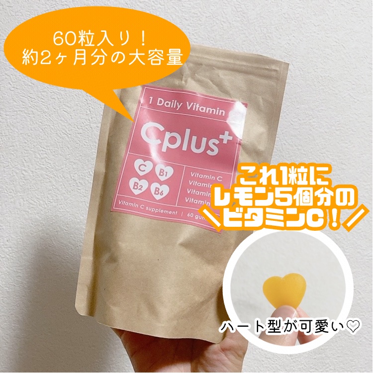 60日分(2ヶ月分)1粒で1日分✨ 1粒で、ビタミンC(体内でコラーゲンを作るための栄養素)、B1(糖質の分解を助ける)、B2(肌や爪、髪の毛の健康を維持、成長を促す働きも)、B6(健康な肌や髪、歯を作る)がとれます! ハート型が可愛い😍 少し硬めのグミです。味は食べやすいレモン風味💛 1粒で栄養素がたくさんとれるの良いですね😌 素敵なお品ありがとうございました🩷