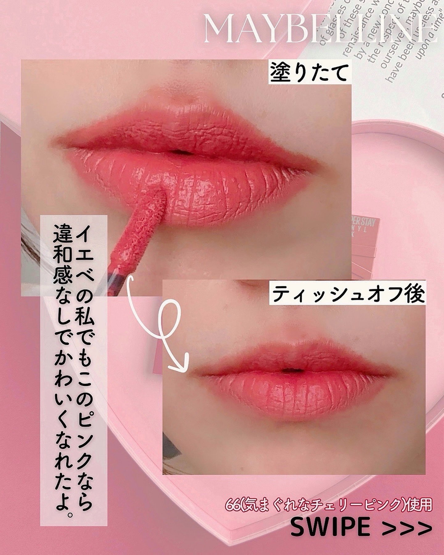 ティッシュオフしてもこすってもツヤ感が消えないのがすごい✨ 青みと黄みの絶妙バランスでどんな肌トーンでも使いやすいピンクカラーが登場💓 飲んだり食べたりしても長時間かわいい唇をキープできるのはうれしいっ👍🏻