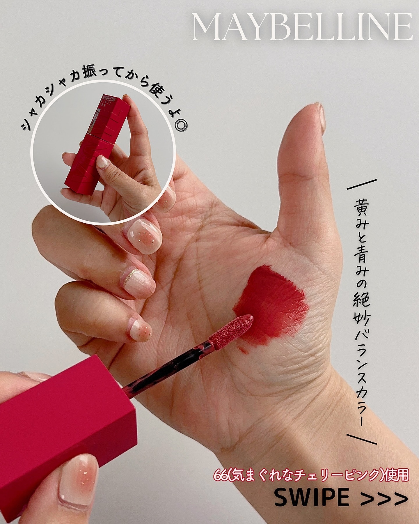 - メイベリン人気No.1リップ からツヤタイプついに誕生!*1 シャカシャカ振って!#落ちないリップ*2 色・ツヤ・仕上がり、全てロック。 〈製品特徴〉 ①シャカシャカ振って、長持ち効果! 膜形成成分*3と高濃度ピグメント*4の2層構造。 シャカシャカ振ると膜形成成分*3と高濃度ピグメント*4が混ざり、 色、ツヤ、仕上がりの長持ち効果! ②色もツヤも落ちない! 最長16時間続く、#落ちないリップ*2 メイベリン独自のトリプルロックフォーミュラ。色・ツヤ・仕上がり、全てロック。 食べても、飲んでも、塗りたての仕上がりが落とすまで続く。*2 ③濃密な発色とツヤをひと塗りで。 塗った瞬間、ムラなく発色。 顔色まで明るくトーンアップするような仕上がりに。*5 ④唇を包み込み、うるおい感ある仕上がりに。 乾燥しにくく、一日中*6心地良い仕上がりに。 塗った瞬間、唇をふっくらとみせ、縦じわが目立ちにくい。 *1:インテージSRI+調べ。2018年9月~2022年7月までのスーパー、ドラッグストア等におけるメイベリン ニューヨーク リップカテゴリーでの売上金額に基づく。 *2:着用16時間を想定した最長の場合において。メイクアップリムーバーで落とすことが可能です。メイベリン ニューヨーク調べ。個人差があります。 *3:トリメチルシロキシケイ酸、ポリプロピルシルセスキオキサン、アルキル(C30-45)ジメチルシリルポリプロピルシルセスキオキサン、ポリメチルシルセスキオキサン/トリメチルシロキシケイ酸。 *4:メイベリン従来品(ウォーター シャイニー ボリューミー パール)と比較において、3倍のピグメントを配合 *5:メイクアップ効果 *6:メイベリン ニューヨーク調べ。個人差があります。