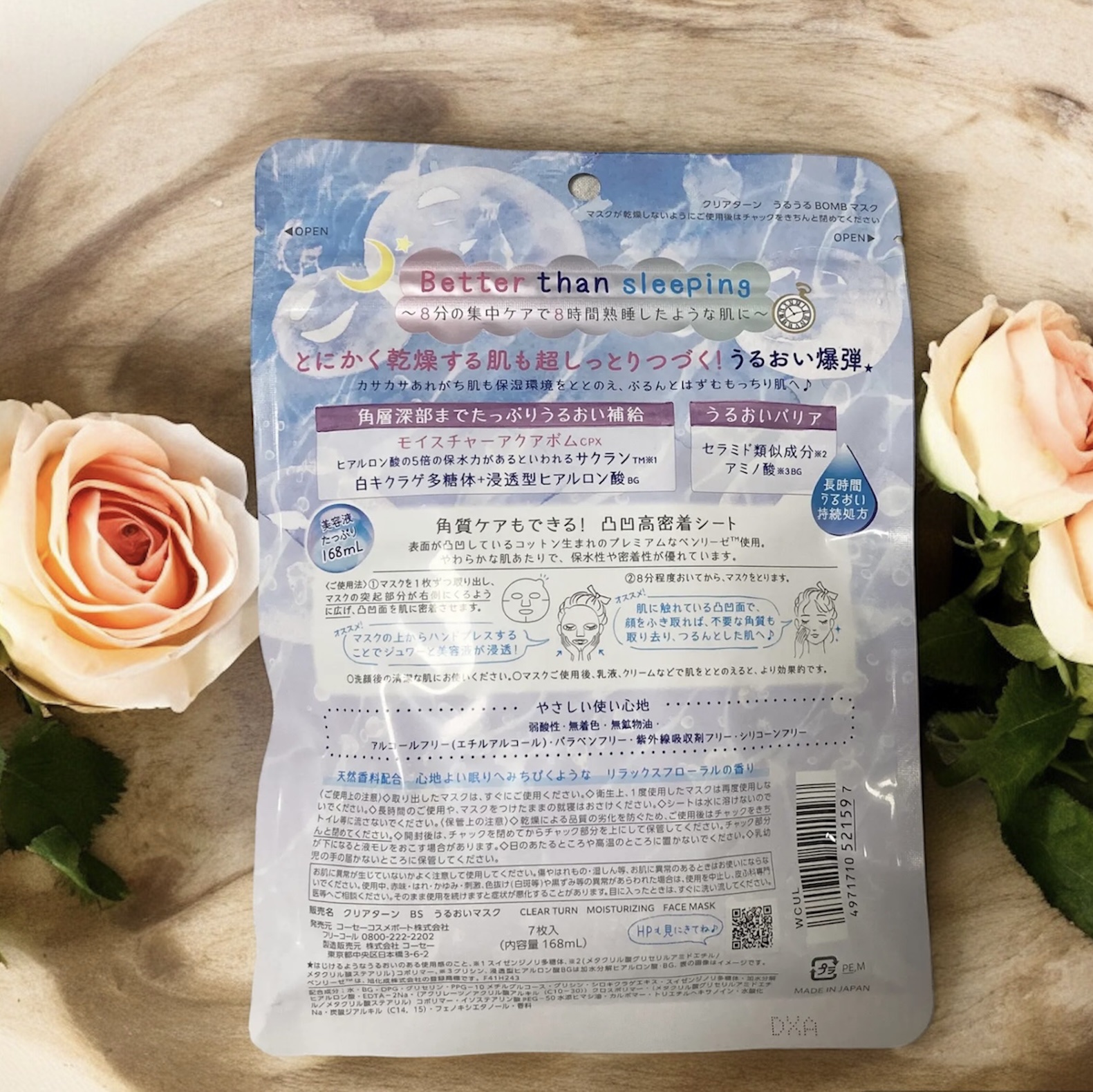 ビタミンBOMBと同様厚手のボコボコしたシートが私のお気に入りです✨✨ ずれ落ちたりせずずっと顔に密着する!! 保湿力があってシートにはトロトロの美容液がたっぷり🩵 仕上がりもベタベタしないのにしっかり内側から潤う感じがとっても好きです😆 何よりパッケージが可愛くてテンション上がる!リピありです!!
