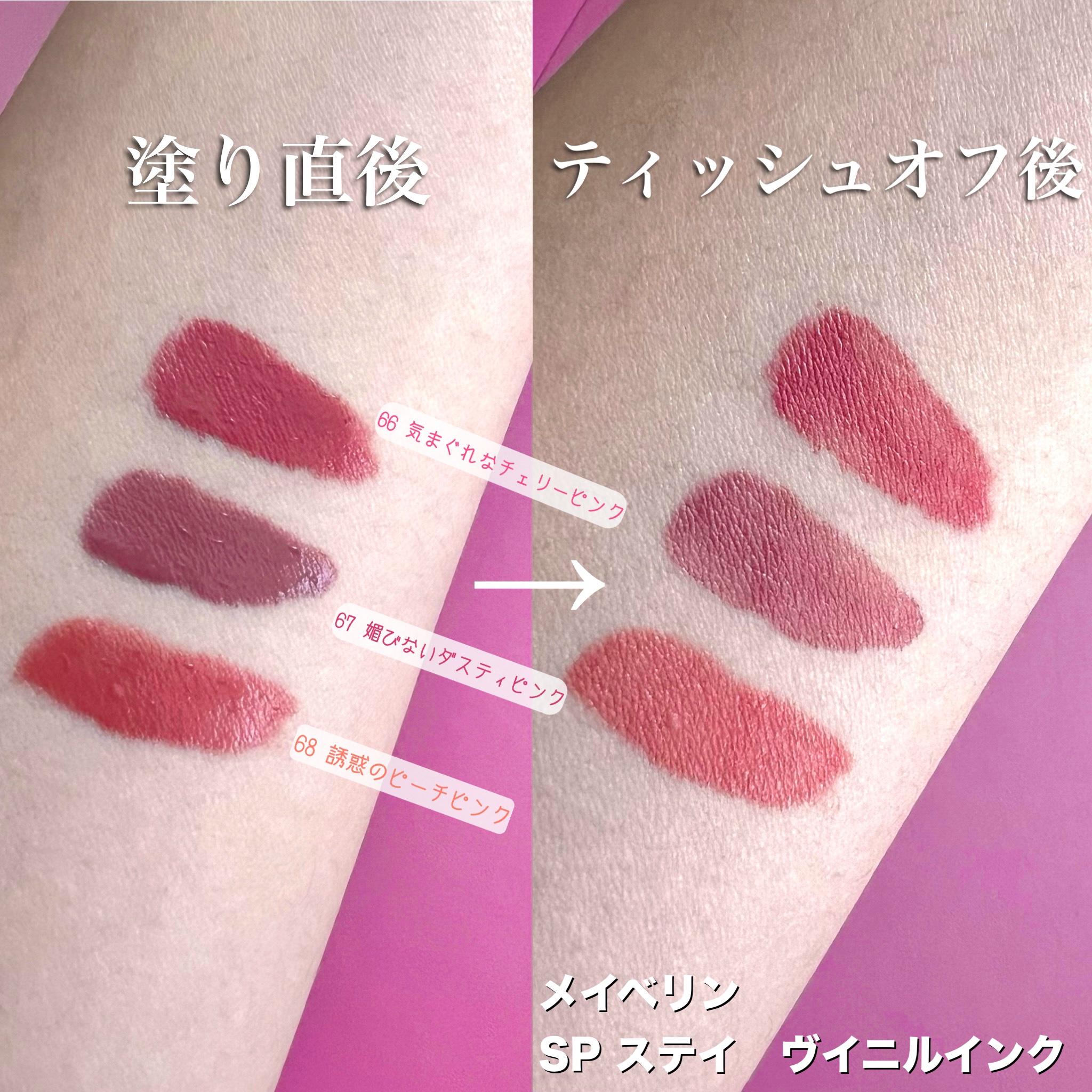 ✼••┈┈••✼••┈┈••✼••┈┈••✼••┈┈••✼MAYBELLINENEWYORKSPステイヴィニルインク✼••┈┈••✼••┈┈••✼••┈┈••✼••┈┈••✼*66気まぐれなチェリーピンク・あまくなりすぎない*67媚びないダス...