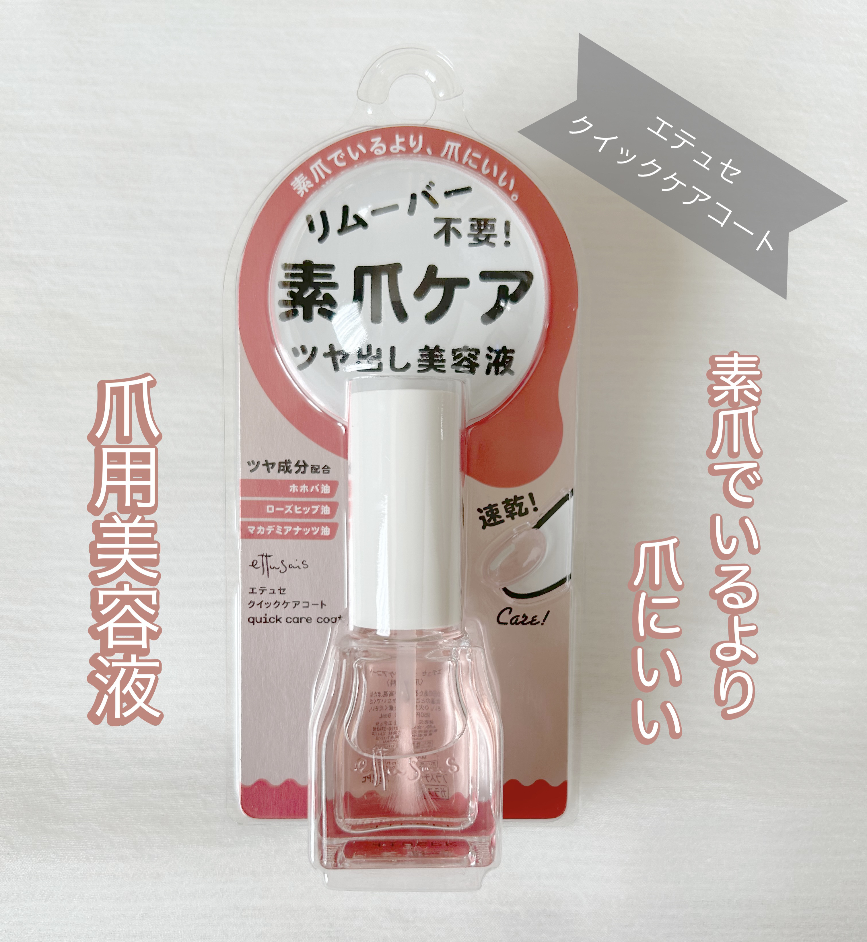 - 素爪でいるより、爪にいい。速乾!リムーバーいらず!透明薄膜ヴェールで爪を保護&ケアする、ツヤ出しネール用美容液。 弱い爪を摩擦や乾燥から保護し、爪のカケ・割れ・二枚爪・乾燥を防ぎます。 塗布すると、エッセンスコート成分が均一な薄膜をつくり、ナチュラル光沢成分&植物オイル(*)が自然なツヤを与えます。 ほんのりピンク色で、爪磨きしたようなナチュラルなツヤ仕上げです。 トルエンフリー、無香料で爪へのやさしさを配慮。 通常のトップコートやハードナーは、一部はがれると、厚みがあるため、凹凸になりますが、「クイックケアコート」は、厚みのない薄膜仕上げなので、落とさず、上から塗布してもキレイになじむので、リムーバーいらずです。 *ホホバ油・ローズヒップ油・マカデミアナッツ油 <こんな時におすすめ> ・爪を保護しながらツヤも出るので、マニキュアをお休みしたい時に ・超速乾だからササッと簡単にケアしたい時に ・ナチュラルなツヤ、仕事上ネールNGでもキレイに見せたい時に 【価格改定について】 いつもご愛用いただきありがとうございます。 この度、原材料高騰などにより、2025年9月1日より、希望小売価格の変更を行うこととなりました。 何卒ご理解を賜わりますよう、心よりお願い申し上げます。 エテュセ クイックケアコート 旧価格 税込1,045円(税抜950円) ↓ 新価格 税込1,265円(税抜1,150円)