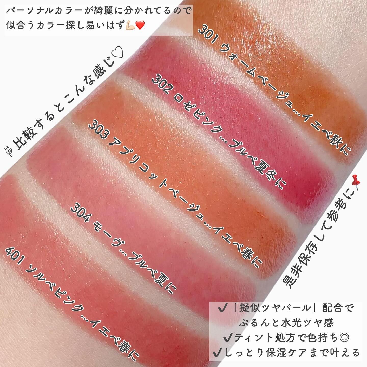 ブルベ夏の大定番といったらこれ!なピンクベージュ。 膜を張ったようなツヤ感が可愛すぎるナチュラルローズ。 明るく柔らかいピュアなニュートラルピンク。 柔らかく可愛らしい印象の新色モーヴピンクベージュ。 しっかり青みを感じる大人っぽい絶妙ローズ。 ほんのりブラウン混じりの落ち着いたダスティローズ。