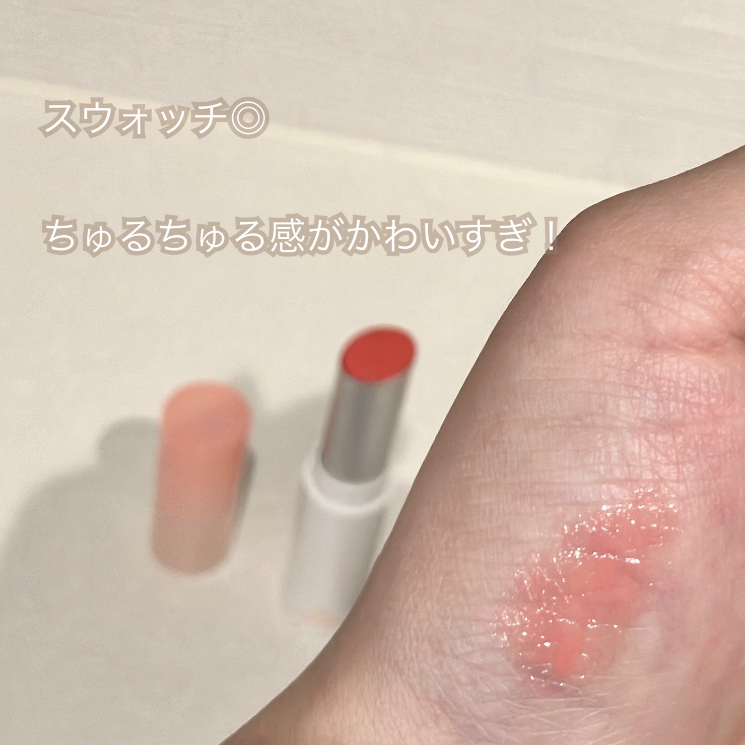- もちっとした水膜で弾けそうなツヤリップ 1.軽い塗り心地のなめらかで透明な水爆弾ツヤ 2.塗った瞬間から唇を鮮やかに彩る多彩なカラーバーム 3.植物性保湿オイルでしっとりもっちり保湿バーム