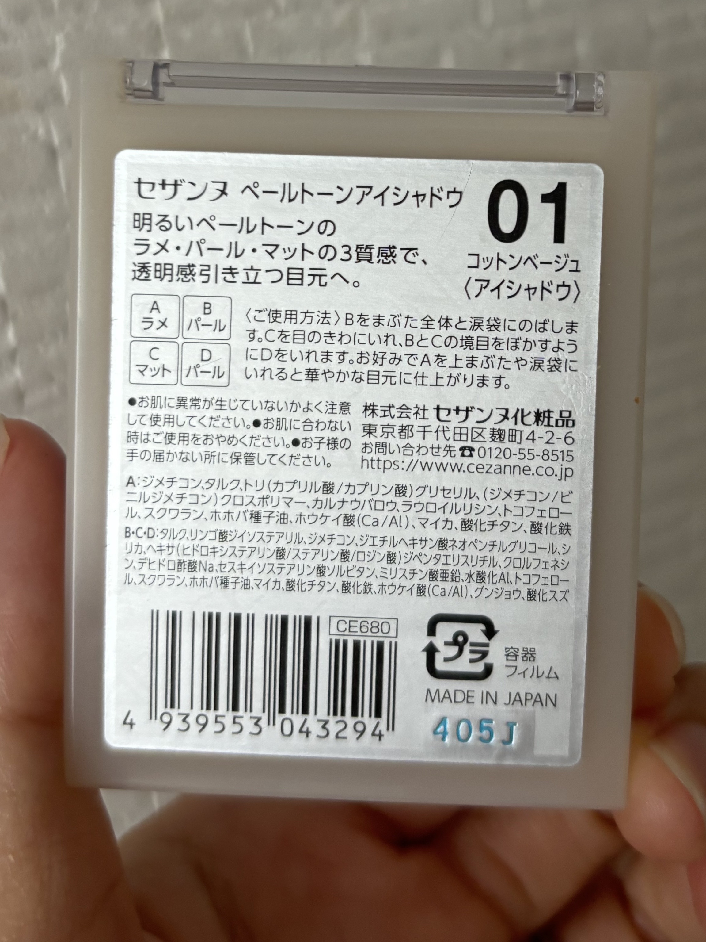 - ≪01 コットンベージュ≫ 〈A〉ジメチコン、タルク、トリ(カプリル酸/カプリン酸)グリセリル、(ジメチコン/ビニルジメチコン)クロスポリマー、カルナウバロウ、ラウロイルリシン、トコフェロール、スクワラン、ホホバ種子油、ホウケイ酸(Ca/Al)、マイカ、酸化チタン、酸化鉄 〈BCD〉タルク、リンゴ酸ジイソステアリル、ジメチコン、ジエチルヘキサン酸ネオペンチルグリコール、シリカ、ヘキサ(ヒドロキシステアリン酸/ステアリン酸/ロジン酸)ジペンタエリスリチル、クロルフェネシン、デヒドロ酢酸Na、セスキイソステアリン酸ソルビタン、ミリスチン酸亜鉛、水酸化Al、トコフェロール、スクワラン、ホホバ種子油、マイカ、酸化チタン、酸化鉄、ホウケイ酸(Ca/Al)、グンジョウ、酸化スズ ≪02 シェリーピンク≫ 〈A〉ジメチコン、タルク、(ジメチコン/ビニルジメチコン)クロスポリマー、トリ(カプリル酸/カプリン酸)グリセリル、カルナウバロウ、ラウロイルリシン、シリカ、トコフェロール、スクワラン、ホホバ種子油、ホウケイ酸(Ca/Al)、マイカ、酸化チタン、酸化鉄、酸化スズ、グンジョウ、コンジョウ 〈BCD〉タルク、リンゴ酸ジイソステアリル、ジメチコン、ジエチルヘキサン酸ネオペンチルグリコール、シリカ、ヘキサ(ヒドロキシステアリン酸/ステアリン酸/ロジン酸)ジペンタエリスリチル、クロルフェネシン、デヒドロ酢酸Na、セスキイソステアリン酸ソルビタン、ミリスチン酸亜鉛、水酸化Al、トコフェロール、スクワラン、ホホバ種子油、マイカ、酸化チタン、酸化鉄、ホウケイ酸(Ca/Al)、グンジョウ、赤226 ≪03 ムーンアメジスト≫ 〈A〉ジメチコン、タルク、(ジメチコン/ビニルジメチコン)クロスポリマー、トリ(カプリル酸/カプリン酸)グリセリル、カルナウバロウ、ラウロイルリシン、トコフェロール、スクワラン、ホホバ種子油、ホウケイ酸(Ca/Al)、マイカ、酸化チタン、酸化鉄 〈BCD〉タルク、リンゴ酸ジイソステアリル、ジメチコン、ジエチルヘキサン酸ネオペンチルグリコール、シリカ、ヘキサ(ヒドロキシステアリン酸/ステアリン酸/ロジン酸)ジペンタエリスリチル、クロルフェネシン、デヒドロ酢酸Na、セスキイソステアリン酸ソルビタン、ミリスチン酸亜鉛、水酸化Al、トコフェロール、スクワラン、ホホバ種子油、マイカ、酸化チタン、酸化鉄、ホウケイ酸(Ca/Al)、グンジョウ、赤226、酸化スズ