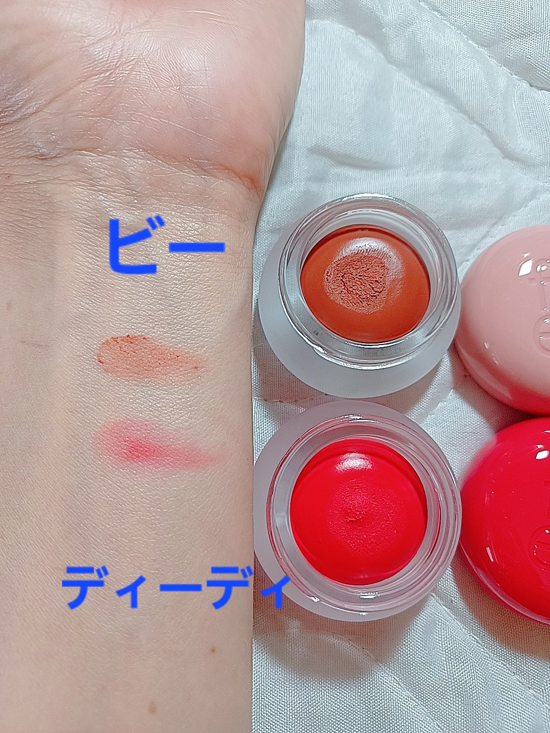 - <CR01 ディア> ダイメジメチコン、(ジメチコン/ビニルジメチコン)クロスポリマー、トリベヘニン、トリイソステアリン酸ポリグリセリル-2、リンゴ酸ジイソステアリル、合成フルオロフロゴパイト、二酸化チタン(CI 77891)、黄色酸化鉄(CI 77492)、カカオシードバター、ブルーアガベ葉エキス、セチルPEG/PPG-10/1ダイメチコン、イソステアリン酸ソルビタン、ビニルジメチコン/メチコンシルセスキオキサン)クロスポリマー、ポリヒドロキシステアリック酸、ジステアルジモニウムヘクトライト、パルミチン酸エチルヘキシル、ラウロイルサルコシン酸ナトリウム、アイソステアリック酸、レシチン、ジイソステアリン酸ポリグリセリル-2、ポリリシノレイン酸ポリグリセリル-3、クエン酸トリエチル、カプリリルグリコール、カプリル酸グリセリル、BG、精製水、香料、黄色5号(CI 15985)、赤色酸化鉄(CI 77491)、赤202(CI 15850)、黒色酸化鉄(CI 77499) <CR02 ボーイ> ダイメジメチコン、(ジメチコン/ビニルジメチコン)クロスポリマー、トリベヘニン、合成フルオロフロゴパイト、リンゴ酸ジイソステアリル、二酸化チタン(CI 77891)、トリイソステアリン酸ポリグリセリル-2、カカオシードバター、ブルーアガベ葉エキス、セチルPEG/PPG-10/1ダイメチコン、イソステアリン酸ソルビタン、ビニルジメチコン/メチコンシルセスキオキサン)クロスポリマー、ポリヒドロキシステアリック酸、ジステアルジモニウムヘクトライト、ジイソステアリン酸ポリグリセリル-2、パルミチン酸エチルヘキシル、ラウロイルサルコシン酸ナトリウム、アイソステアリック酸、レシチン、ポリリシノレイン酸ポリグリセリル-3、クエン酸トリエチル、カプリリルグリコール、カプリル酸グリセリル、BG、精製水、香料、黄色5号(CI 15985)、赤色104号(1) (CI 45410)、赤色酸化鉄(CI 77491)、赤202(CI 15850)、黄色4号(CI 19140) <CR03 ビーエフエフ> ダイメジメチコン、(ジメチコン/ビニルジメチコン)クロスポリマー、トリベヘニン、トリイソステアリン酸ポリグリセリル-2、リンゴ酸ジイソステアリル、合成フルオロフロゴパイト、二酸化チタン(CI 77891)、赤色104号(1) (CI 45410)、カカオシードバター、ブルーアガベ葉エキス、セチルPEG/PPG-10/1ダイメチコン、イソステアリン酸ソルビタン、ビニルジメチコン/メチコンシルセスキオキサン)クロスポリマー、ポリヒドロキシステアリック酸、ジイソステアリン酸ポリグリセリル-2、ジステアルジモニウムヘクトライト、パルミチン酸エチルヘキシル、ラウロイルサルコシン酸ナトリウム、アイソステアリック酸、レシチン、ポリリシノレイン酸ポリグリセリル-3、クエン酸トリエチル、カプリリルグリコール、カプリル酸グリセリル、BG、精製水、香料、黄色4号(CI 19140)、黄色酸化鉄(CI 77492)、赤202(CI 15850)、赤色201号 (CI 15850) <CR04 セブンティーン> ダイメジメチコン、(ジメチコン/ビニルジメチコン)クロスポリマー、トリベヘニン、リンゴ酸ジイソステアリル、トリイソステアリン酸ポリグリセリル-2、合成フルオロフロゴパイト、二酸化チタン、カカオシードバター、ブルーアガベ葉エキス、セチルPEG/PPG-10/1ダイメチコン、イソステアリン酸ソルビタン、ビニルジメチコン/メチコンシルセスキオキサン)クロスポリマー、ポリヒドロキシステアリック酸、ジステアルジモニウムヘクトライト、ジイソステアリン酸ポリグリセリル-2、パルミチン酸エチルヘキシル、ラウロイルサルコシン酸ナトリウム、アイソステアリック酸、レシチン、ポリリシノレイン酸ポリグリセリル-3、クエン酸トリエチル、カプリリルグリコール、カプリル酸グリセリル、BG、精製水、香料、赤色酸化鉄、赤色201号、黄色4号、赤色202号、黄色酸化鉄 <CR05 ガールズ> ダイメジメチコン、(ジメチコン/ビニルジメチコン)クロスポリマー、トリベヘニン、トリイソステアリン酸ポリグリセリル-2、合成フルオロフロゴパイト、黄色5号(CI 15985)、リンゴ酸ジイソステアリル、カカオシードバター、ブルーアガベ葉エキス、セチルPEG/PPG-10/1ダイメチコン、イソステアリン酸ソルビタン、ビニルジメチコン/メチコンシルセスキオキサン)クロスポリマー、ポリヒドロキシステアリック酸、ジイソステアリン酸ポリグリセリル-2、ジステアルジモニウムヘクトライト、パルミチン酸エチルヘキシル、ラウロイルサルコシン酸ナトリウム、アイソステアリック酸、レシチン、ポリリシノレイン酸ポリグリセリル-3、クエン酸トリエチル、カプリリルグリコール、カプリル酸グリセリル、BG、精製水、香料、黄色4号(CI 19140)、赤202(CI 15850)、二酸化チタン(CI 77891)、赤色201号 (CI 15850) <MV01 チリン> ダイメジメチコン、(ジメチコン/ビニルジメチコン)クロスポリマー、トリベヘニン、トリイソステアリン酸ポリグリセリル-2、リンゴ酸ジイソステアリル、合成フルオロフロゴパイト、酸化チタン (CI 77891)、赤色酸化鉄(CI 77491)、黄色酸化鉄(CI 77492)、カカオシードバター、ブルーアガベ葉エキス、セチルPEG/PPG-10/1ダイメチコン、イソス