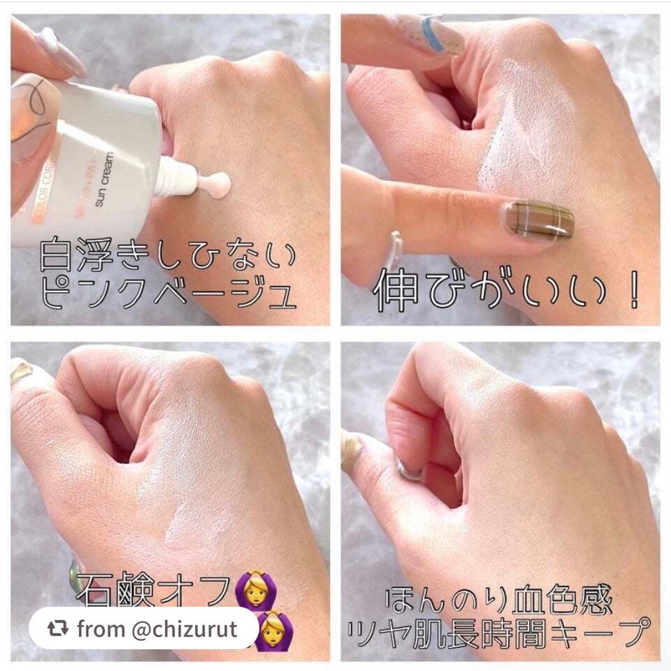 - <ピンク> 水、酸化チタン、ペンチレングリコール、BG、グリセリン、ヒアルロン酸Na、加水分解ヒアルロン酸、キサンタンガム、スクワラン、トコフェロール、アロエベラ葉エキス、ホホバ種子油、アルミナ、ステアリン酸、アジピン酸ジブチル、プロパンジオール、カプリリルグリコール、ポリヒドロキシステアリン酸、ヒドロキシプロピルメチルセルロースステアロキシエーテル、炭酸ジカプリリル、エチルヘキシルグリセリン、ツボクサエキス、ドクダミエキス、スベリヒユエキス、トリエトキシカプリリルシラン、アオモジ果実油、クエン酸、カプリル酸グリセリル、ロドデンドロンフェルギネウムエキス、1,2-ヘキサンジオール、アラントイン、ステアリン酸スクロース、オレンジ油、(アクリロイルジメチルタウリンアンモニウム/VP)コポリマー、ダマスクバラ花水、ナイアシンアミド、ラウリルカルバミン酸イヌリン、マンダリンオレンジ果皮油、(カプリル酸/カプリン酸)ヤシアルキル、リン酸2Na、リモネン、リナロール、シトラール、シラカンバ樹液、メチルプロパンジオール、アデノシン、ジエチルアミノヒドロキシベンゾイル安息香酸ヘキシル、ヤマザクラ花エキス、ビオサッカリドガム-1、t-ブタノール、ポリアクリレートクロスポリマー-6、ポリシリコーン-15、モモ果実エキス、ツベルマグナツムエキス、エチルヘキシルトリアゾン、ヤナギラン花/葉/茎エキス、(VP/エイコセン)コポリマー、カプリン酸ポリグリセリル-2、モモ花エキス、サリチル酸ブチルオクチル、ポリエーテル-1、酸化鉄(CI 77492)、酸化鉄(CI 77491)