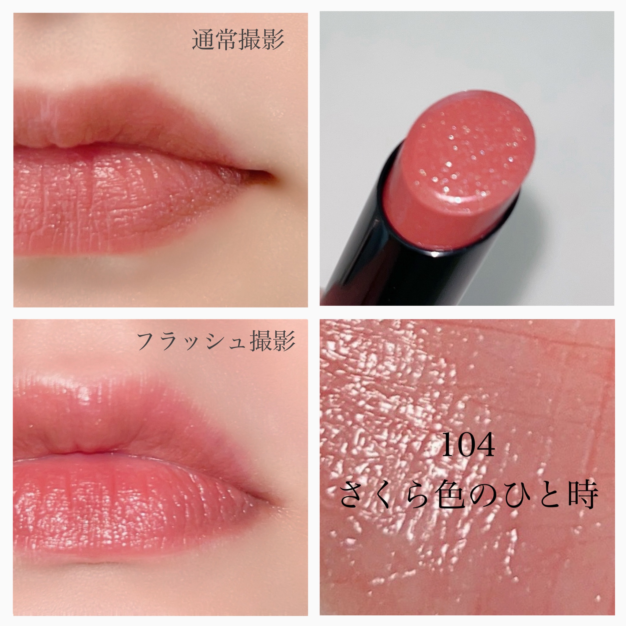 やさしいグリーンパールを纏う 柔らかく深いオールドピンク くすみピンクカラー PC問わず使いやすい コーラルピンク系なので103よりも黄みカラー 唇にのせると自然で動きがあるとチラチラみえて綺麗 使っていてザラザラしませんでした