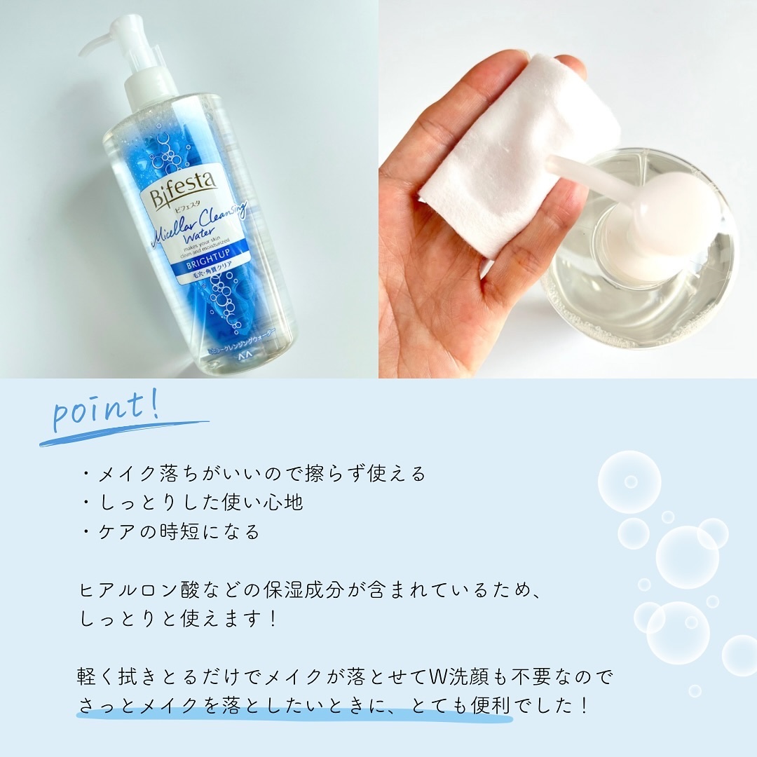 ビフェスタ ミセラークレンジングウォーターブライトアップ使い切り&リピート✨本当に水みたいなサラサラのテクスチャーでコットンにとって軽く肌を拭き取るだけでメイクがオフできるので便利です🥰混合肌の私は朝起きると鼻周りやおでこにかなり油分がじゅわ...