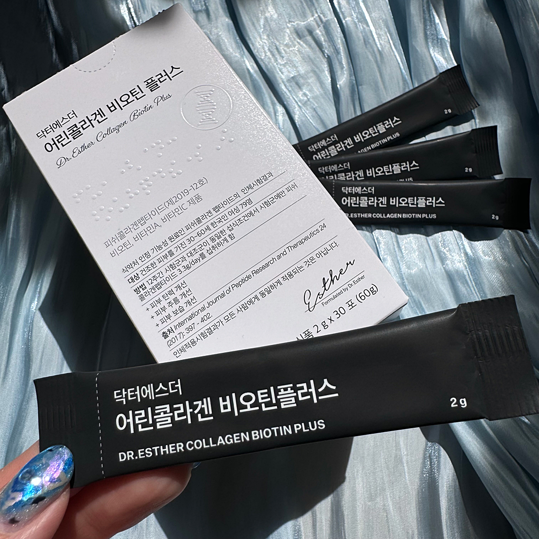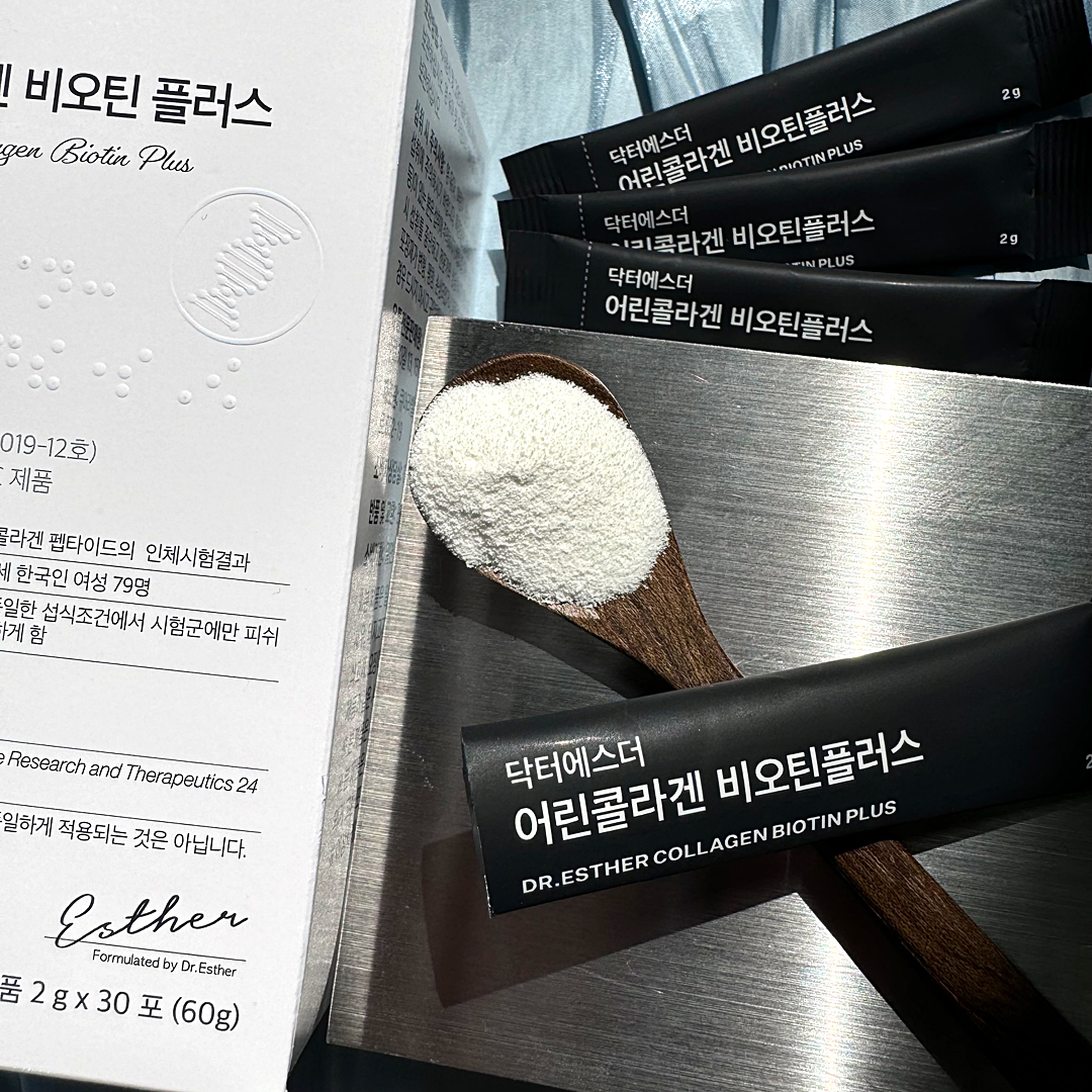 - 機能性原料フィッシュコラーゲン3,2700㎎にフランス産ビオチン4,000%とヨ・エスター博士が直接選んだ二つのビタミンを配合しました。