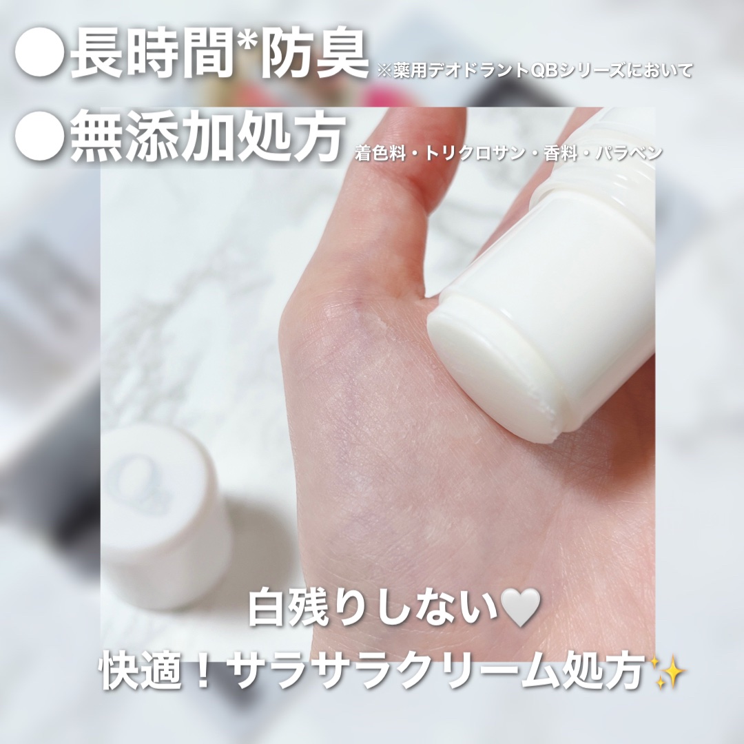 - 【医薬部外品】 目指したのは酷暑40℃対応デオドラント 20年こだわり続けた デオドラントの集大成* ニオイの悩み、裏切らない 手を汚さず塗り直しカンタン 手を汚さずにしっかり塗りこめるスティックタイプ 汗を抑え、ニオイの原因となる「雑菌の繁殖」を防ぎ、 気になるニオイを防ぎます 殺菌有効成分「イソプロピルメチルフェノール」「塩化ベンザルコニウム」を配合し、ニオイ菌を殺菌。 また制汗有効成分「クロルヒドロキシアルミニウム」で汗を抑え、過酷な気温状況下でも負けないデオドランドバーです。 *QB薬用デオドラントシリーズにおいて