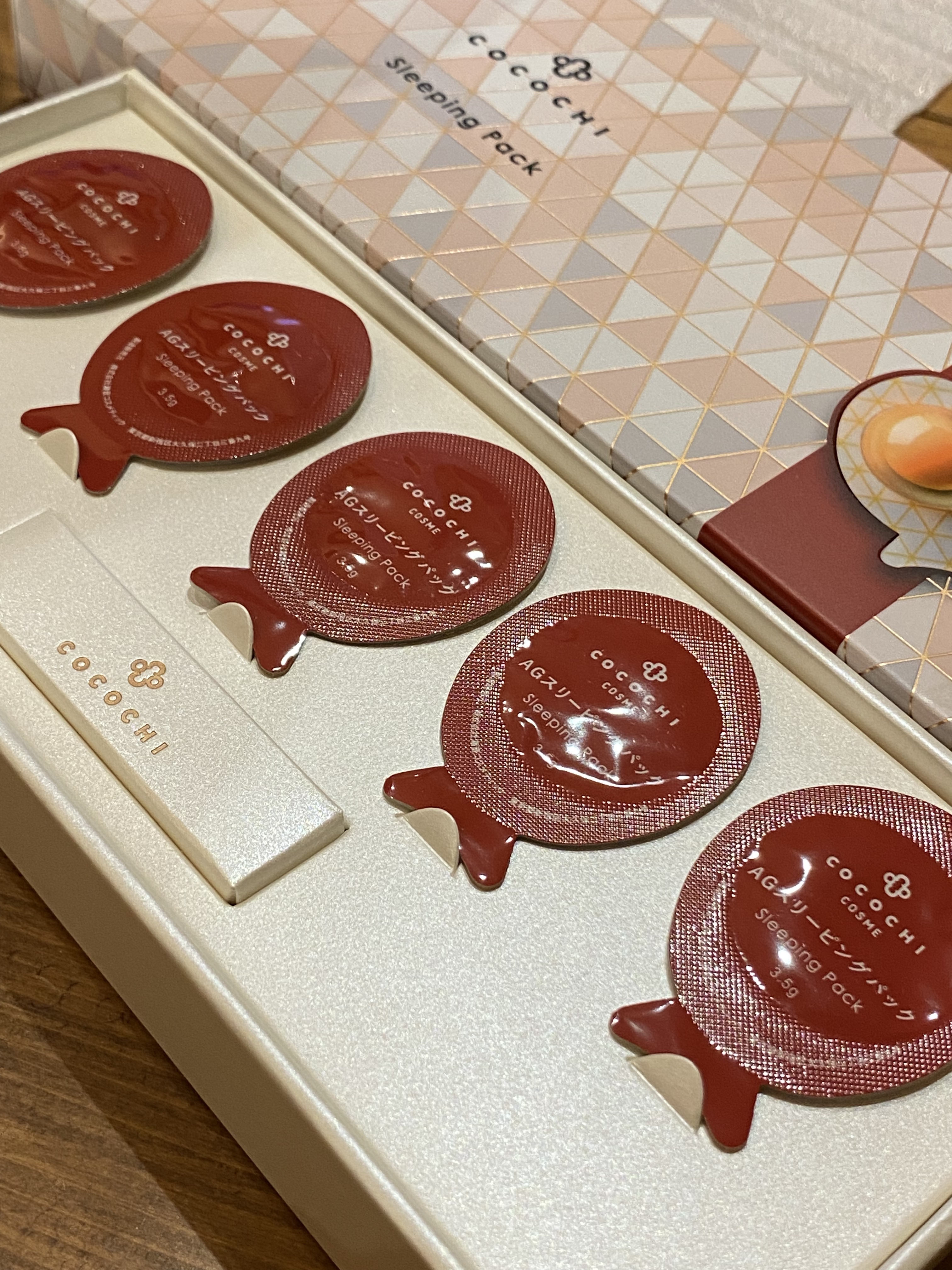 - <ココチ AG スリーピングパック N> 水、BG、エタノール、テトラエチルヘキサン酸ペンタエリスリチル、グリセリン、DPG、ビスPEG-18メチルエーテルジメチルシラン、ジメチコン、トリエチルヘキサノイン、シクロヘキサシロキサン、セテアリルアルコール、(C14-22)アルコール、カルボマー、フェノキシエタノール、セルロース、ポリアクリレート-13、トロメタミン、1,2-ヘキサンジオール、ペンチレングリコール、ポリイソブテン、(C12-20)アルキルグルコシド、シクロペンタシロキサン、ナイアシンアミド、EDTA-2Na、(アクリル酸ヒドロキシエチル/アクリロイルジメチルタウリンNa)コポリマー、ポリソルベート20、ポリシリコーン-11、イソステアリン酸ソルビタン、シリカ、コーン油、β-カロチン、ポリクオタニウム-51、ヒアルロン酸Na、水溶性プロテオグリカン、トリ(カプリル酸/カプリン酸)グリセリル、シアノコバラミン、アスタキサンチン、パルミトイルペンタペプチド-4、香料、ベニバナ赤、酸化鉄