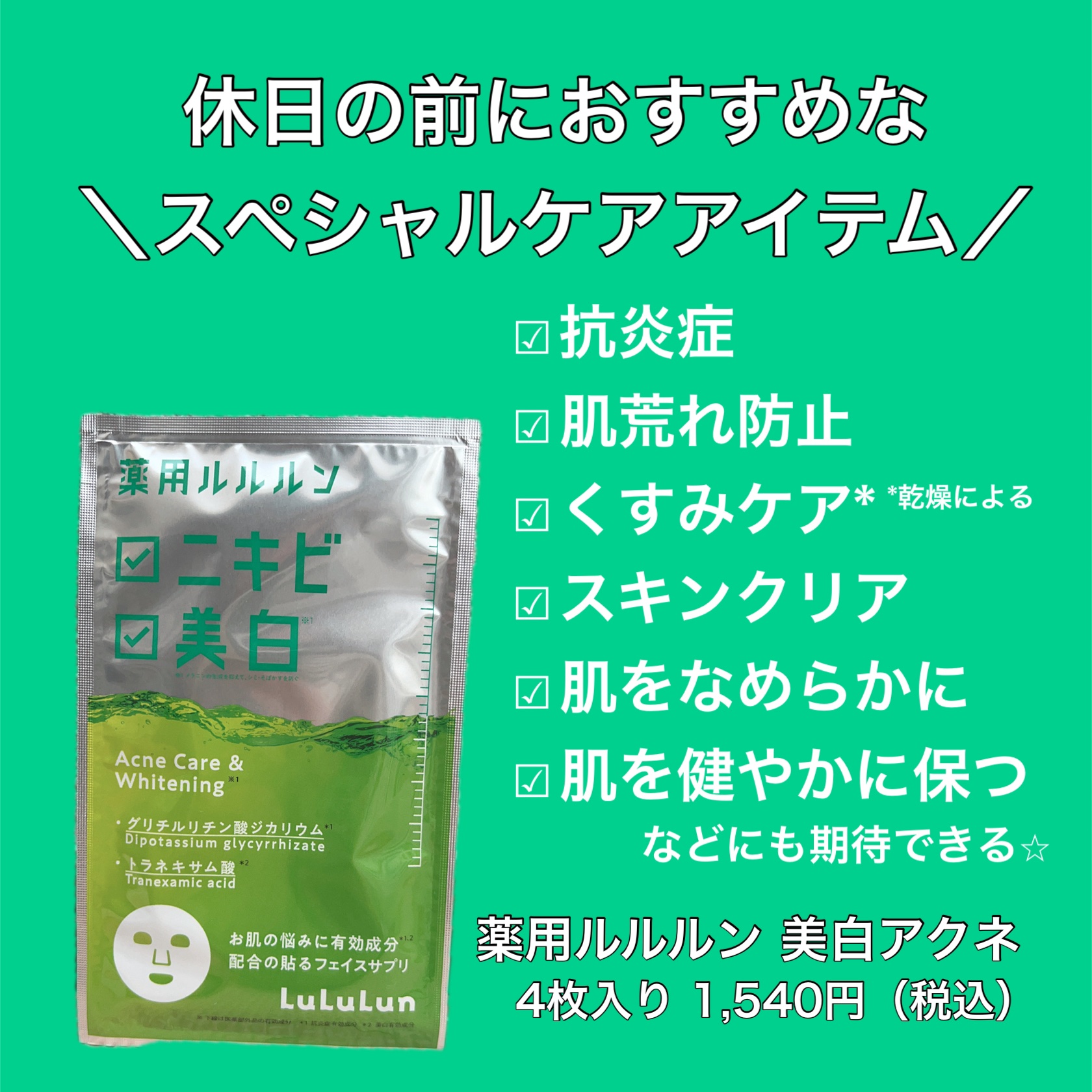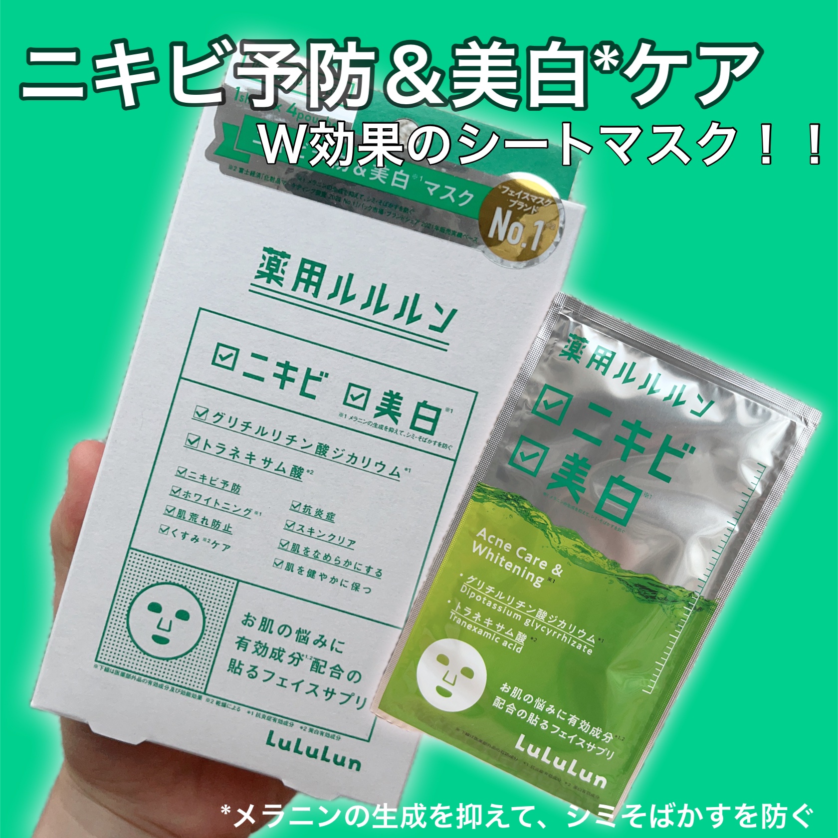- 【医薬部外品】 ルルルン初の医薬部外品、「薬用ルルルン」が登場。 「薬用ルルルン 美白アクネ」はニキビを予防したい方、美白※1・くすみ※2をケアしたい方におすすめ。 (※1 メラニンの生成を抑えて、シミ・そばかすを防ぐ ※2乾燥による)