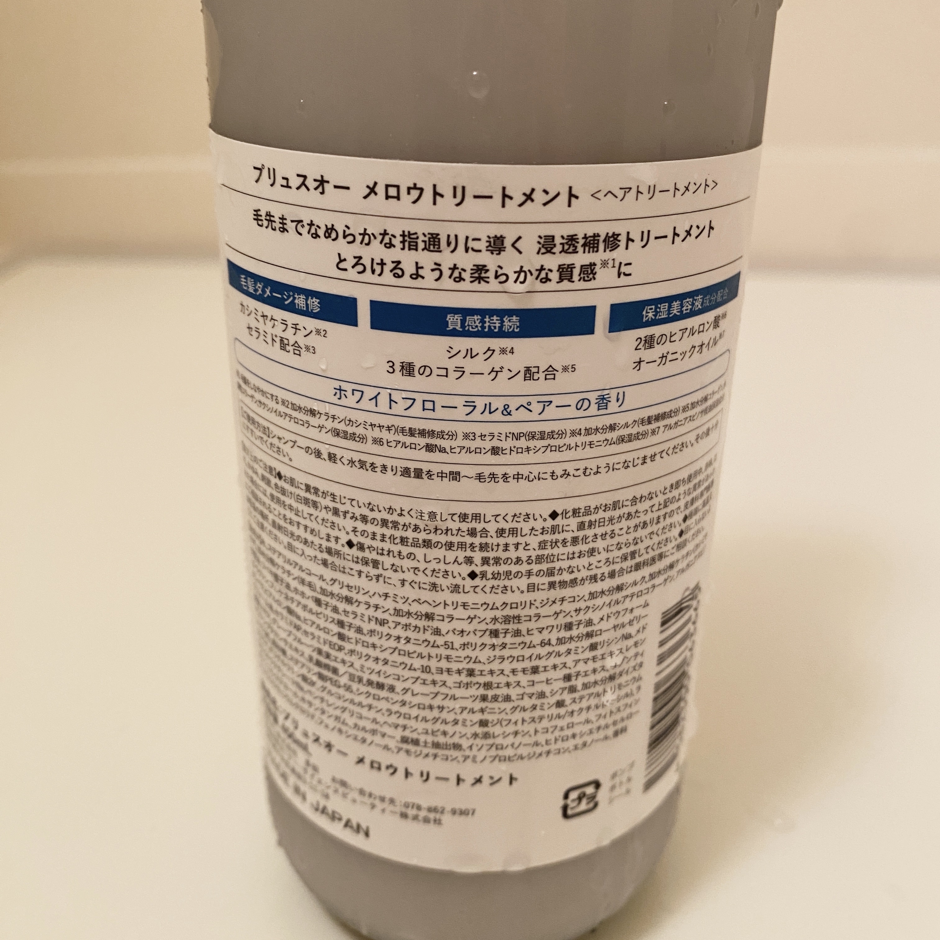 髪のケア成分が豊富に配合され、まるでサロン級の仕上がりに✨ カシミヤ由来のケラチンをはじめ、3種類のケラチン、シルクPPT、コラーゲンPPT、そしてCMC類似成分など、髪の補修成分がたっぷり入っています。 カラーリングや熱ダメージによるパサつき、広がり、ゴワつきなどの悩みをしっかりケアしてくれるので、傷んだ髪もしっかり補修✨ ホワイトフローラルとペアーの上品な香りが私好みでした!すーっと指通りが良く、毎日のヘアケアが楽しみになります✨