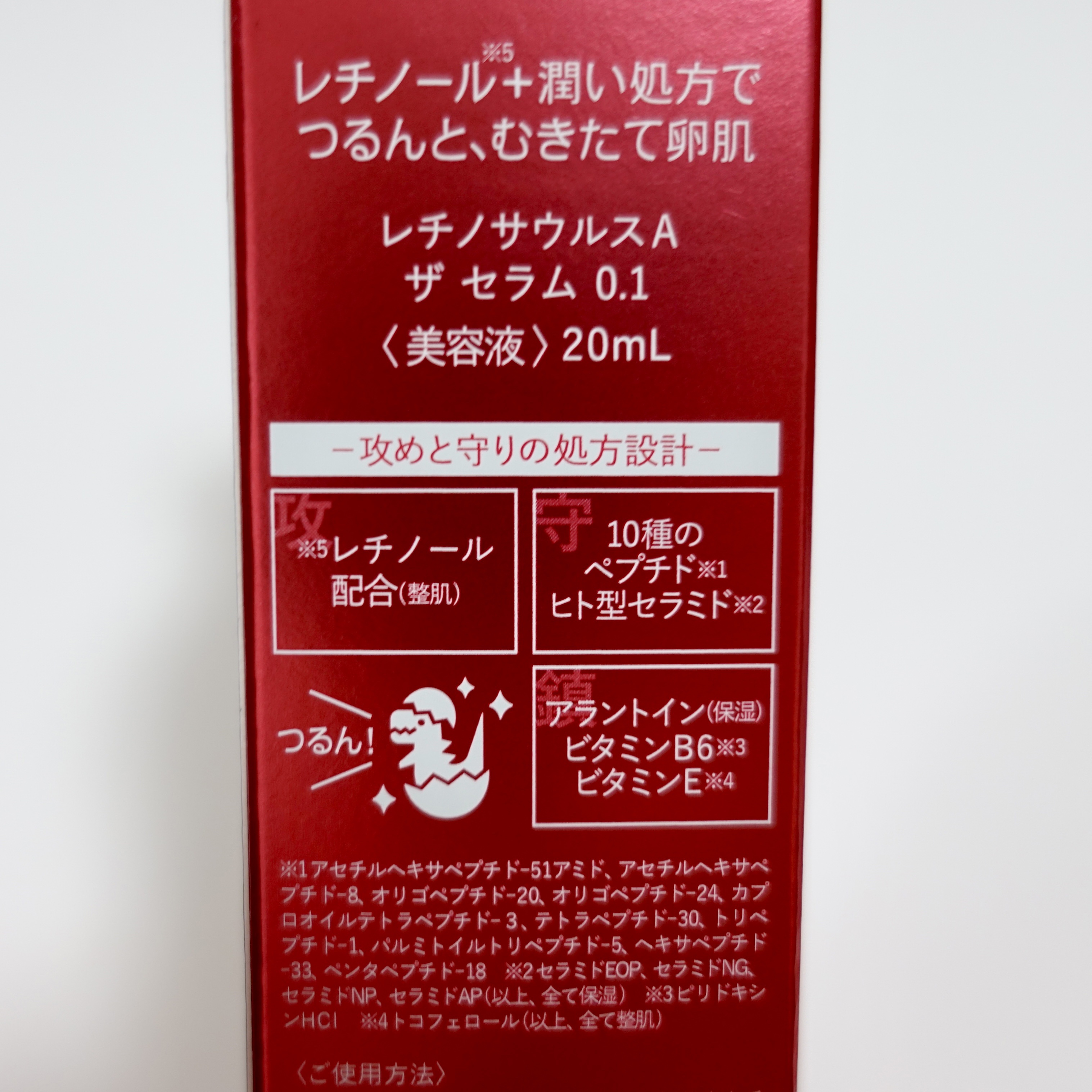 - 攻めのレチノール*1 +守りの潤いバリア! つるんと、むきたて卵肌にみちびくレチノール*1 配合美容液。 攻めと守りの処方設計でお肌が持ち上がるようなハリ感とツヤがあるむき卵肌に! 【攻】お肌にしっかり浸透*2 高濃度レチノール*1 ザ・セラム0.1配合 【守】お肌に必要な潤いと肌あれを防ぐ潤いバリア ・10種のペプチド*3 ・ヒト型セラミド*4 ・アラントイン(保湿) ・ビタミンB6 *5 ・ビタミンE *6 ご使用方法に十分ご注意ください。 〈ご使用方法〉 化粧水等でお肌を整えた後、パール粒1個程度を手に取りお肌になじませます。 その後、乳液やクリーム等を重ねてお使いください。 夜のご使用をおすすめしています。 朝ご使用する際は日焼け止めを必ずご使用ください。 1日1回程度のご使用がおすすめです。 *1 レチノール(整肌) *2 角層まで *3 アセチルヘキサペプチド-51アミド、アセチルヘキサペプチド-8、オリゴペプチド-20、オリゴペプチド-24、カプロオイルテトラペプチド-3、テトラペプチド-30、トリペプチド-1、パルミトイルトリペプチド-5、ヘキサペプチド-33、ペンタペプチド-18 *4 セラミドEOP、セラミドNG、セラミドNP、セラミドAP(以上、全て保湿) *5 ピリドキシンHCl(整肌) *6トコフェロール(以上、全て整肌)
