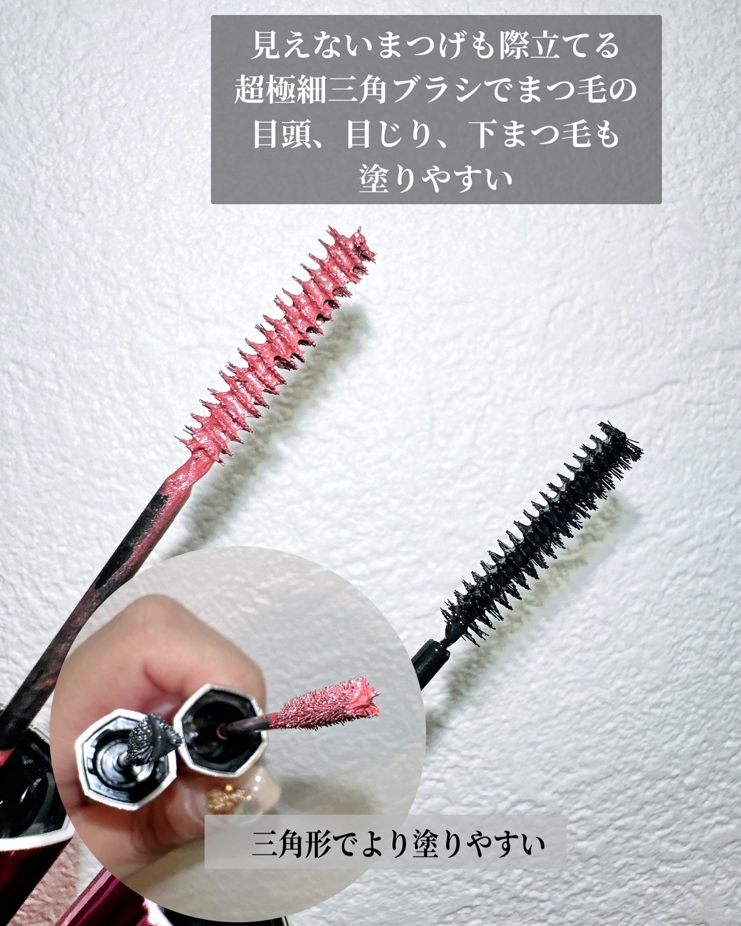 - ロングでもボリュームでもない、「自まつげを際立てる」という新発想 “見えないまつげ”も1本残らず際立てて、目ヂカラを最大限に引き出す 1.うぶ毛レベルの“見えないまつげ”も際立てる「高密着フィルム」 2.あらゆるまつげも1本残らず際立てる「超極細三角ブラシ」