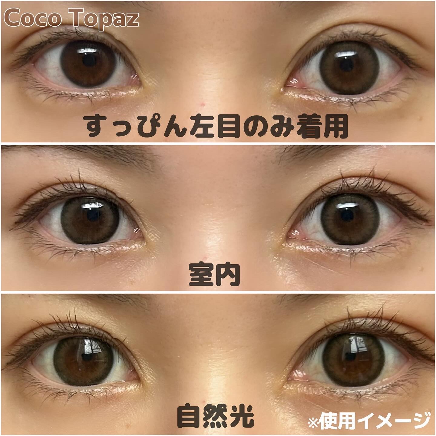 トパーズ使用カラー:ココトパーズうるツヤきゅるん明るめブラウン・オレンジブラウン系カラーくすみ感がありつつ透明感のあるレンズ大きめサイズ×中太フチでしっかり盛れるけど派手すぎない。お気に入りでリピしてます💖【スペック】1day/DIA14.5...