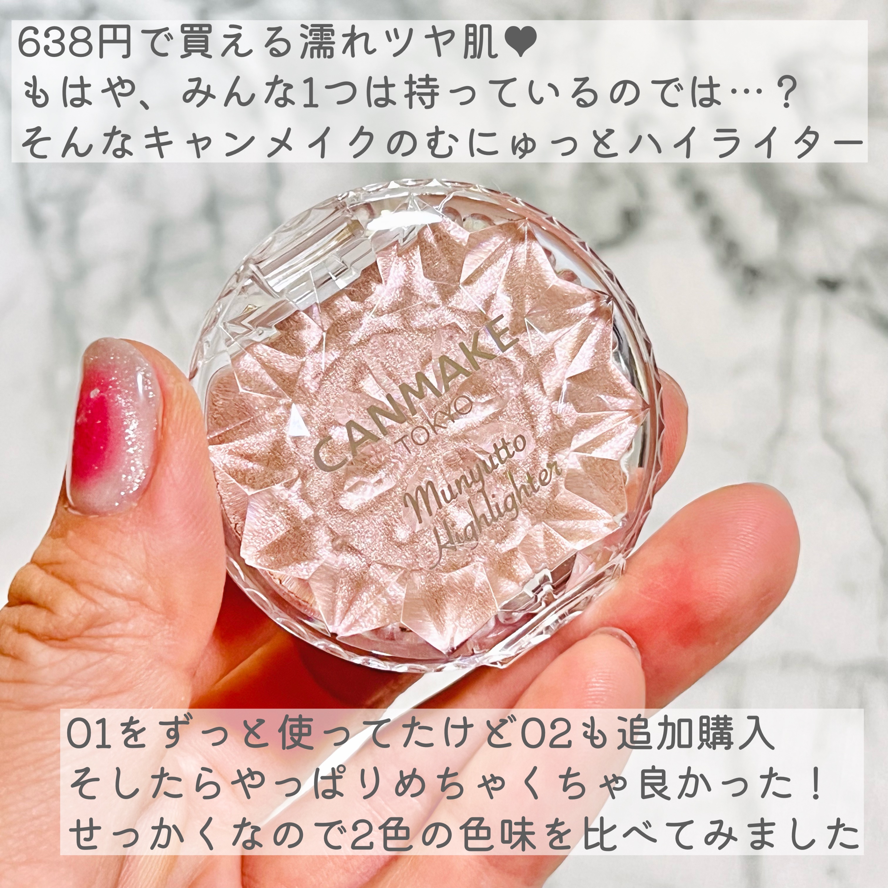 キャンメイクむにゅっとハイライター02ローズクォーツ¥638キャンメイクから出てるハイライトで、すごく柔らかい。ほんとに、むにゅっとしてる。クリームハイライトで名前の通りむにゅっとした質感だけど、塗るとサラサラに。ピンクがかったパールがとても...