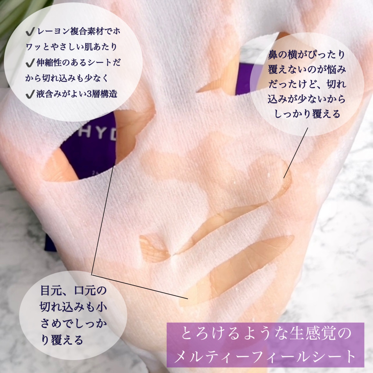 | スキンケアランキング第60位 | 袋を開けた瞬間から美容液がたっぷりで贅沢感 シートは薄めなのに破れにくく、顔全体にピタッと密着。液だれしにくいのでながらケアにも◎ | 詳細を見る | |