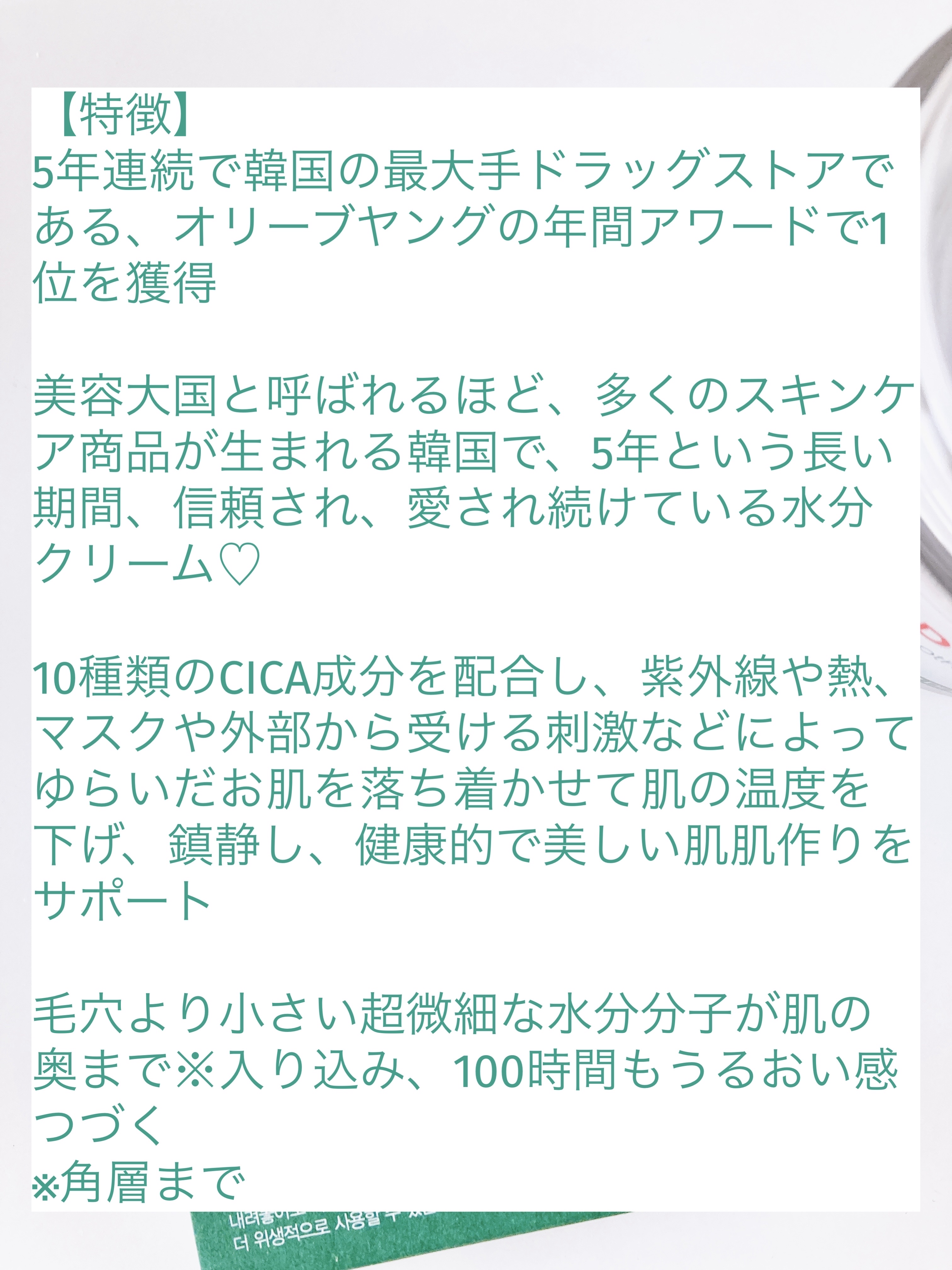- 美容大国と呼ばれるほどたくさんのスキンケア商品が毎日生まれる韓国で、5年という長い期間、多くの人に愛され続けている水分クリームです。 10種類のCICA成分*を配合し、紫外線や熱、マスクなどによる物理的な刺激、外部から受ける乾燥などの刺激によって、乱れやすい肌をひんやりとした使い心地で整え、健やかで美しい肌を保つのを助けます。 毛穴より小さい超微細な水分分子が肌の角質層まで入り込み、長時間保湿感が持続します。 *整肌成分