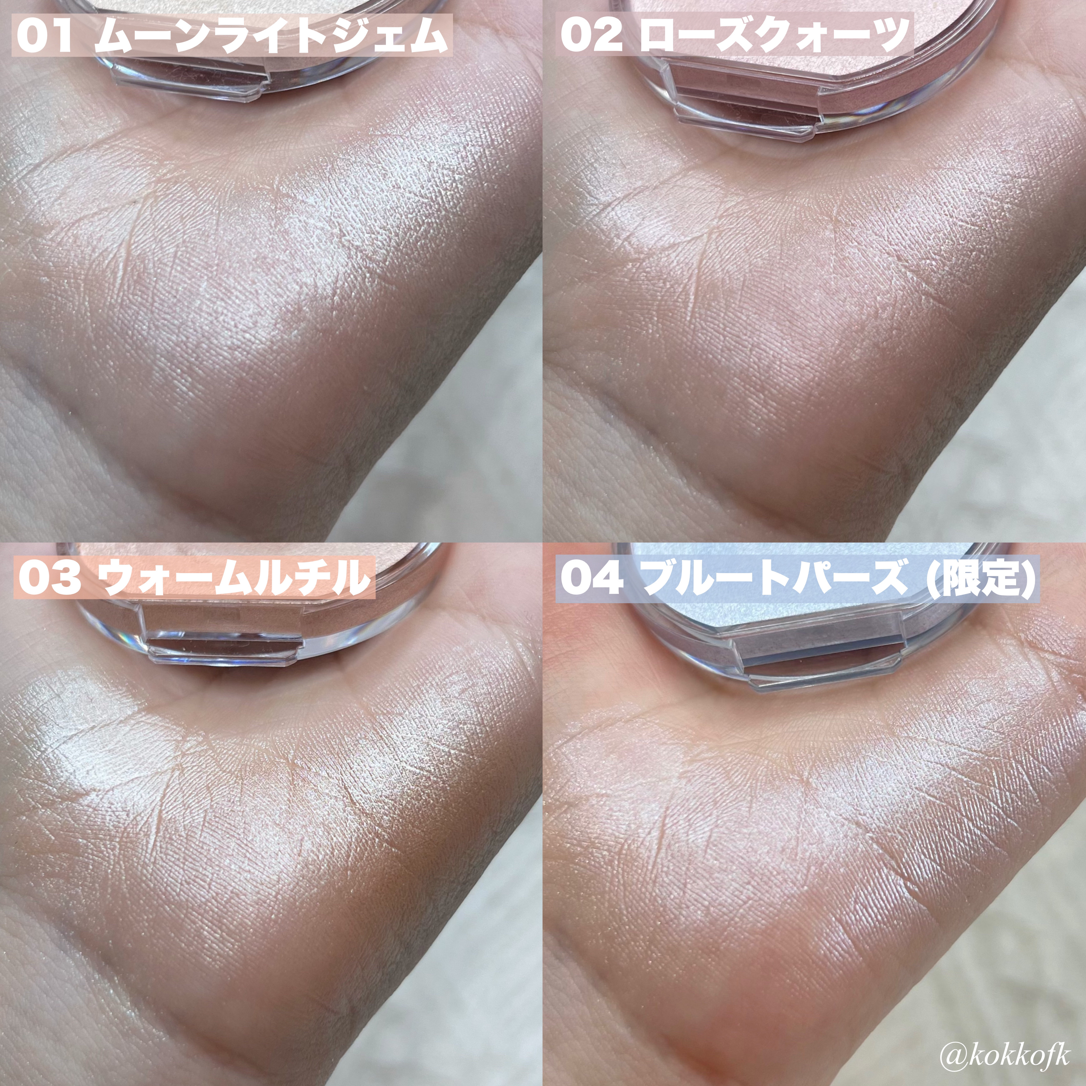 - <01 ムーンライトジェム> トリエチルヘキサノイン、合成フルオロフロゴパイト、ジメチコン、リンゴ酸ジイソステアリル、(ジメチコン/ビニルジメチコン)クロスポリマー、シリカ、スクワラン、オリーブ果実油、セラミドNP、ホホバ種子油、カニナバラ果実油、パルミチン酸レチノール、ツボクサ葉エキス、BG、マイクロクリスタリンワックス、パラフィン、トコフェロール、フェノキシエタノール、メチルパラベン、ジパルミチン酸アスコルビル、酸化チタン、酸化鉄、水酸化Al、酸化スズ <02 ローズクォーツ> トリエチルヘキサノイン、合成フルオロフロゴパイト、ジメチコン、リンゴ酸ジイソステアリル、(ジメチコン/ビニルジメチコン)クロスポリマー、シリカ、スクワラン、オリーブ果実油、セラミドNP、ホホバ種子油、カニナバラ果実油、パルミチン酸レチノール、ツボクサ葉エキス、BG、マイクロクリスタリンワックス、パラフィン、トコフェロール、フェノキシエタノール、メチルパラベン、ジパルミチン酸アスコルビル、マイカ、酸化チタン、酸化鉄、赤202、水酸化Al、酸化スズ <03 ウォームルチル> トリエチルヘキサノイン、ジメチコン、合成フルオロフロゴパイト、リンゴ酸ジイソステアリル、(ジメチコン/ビニルジメチコン)クロスポリマー、シリカ、スクワラン、オリーブ果実油、セラミドNP、ホホバ種子油、カニナバラ果実油、パルミチン酸レチノール、ツボクサ葉エキス、BG、マイクロクリスタリンワックス、パラフィン、トコフェロール、フェノキシエタノール、メチルパラベン、ジパルミチン酸アスコルビル、マイカ、酸化チタン、酸化鉄、水酸化Al、酸化スズ <04 ブルートパーズ> トリエチルヘキサノイン、ジメチコン、合成フルオロフロゴパイト、リンゴ酸ジイソステアリル、(ジメチコン/ビニルジメチコン)クロスポリマー、シリカ、スクワラン、オリーブ果実油、セラミドNP、ホホバ種子油、カニナバラ果実油、パルミチン酸レチノール、ツボクサ葉エキス、BG、マイクロクリスタリンワックス、パラフィン、トコフェロール、フェノキシエタノール、メチルパラベン、ジパルミチン酸アスコルビル、マイカ、酸化チタン、コンジョウ、グンジョウ、水酸化Al、酸化スズ