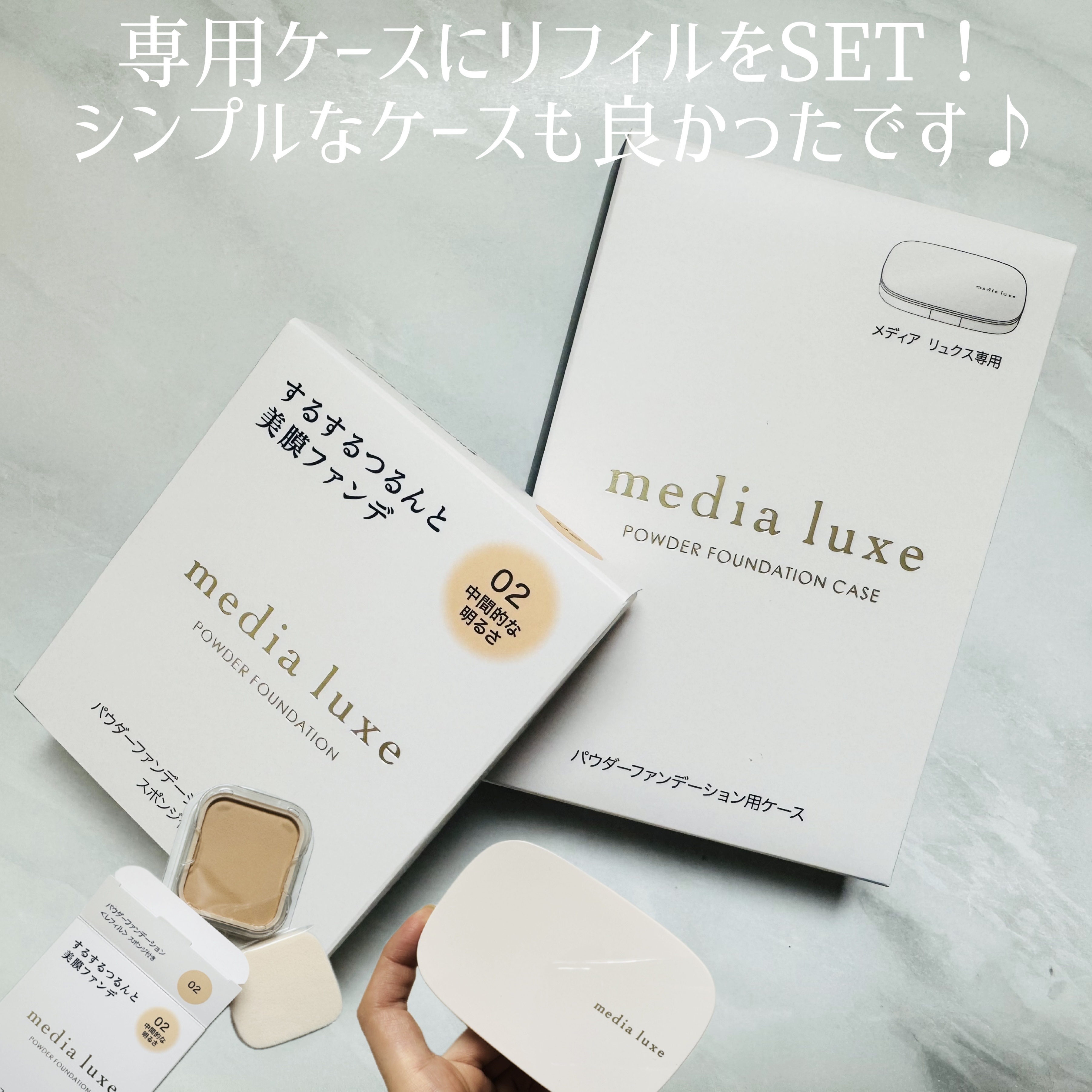 こちらは、株式会社カネボウ化粧品のメイクアップブランド「media luxe」のパウダーファンデーション。 こちらのファンデーションは、シミ・くすみ・毛穴目立ちなどの肌悩みにも自然な明るさで美しくカバーし、ひと塗りでつるたま肌仕上がりを叶えるファンデーション。 仕上がりもとても綺麗でプチプラでパウダーなのに艶っぽくなるファンデーション。