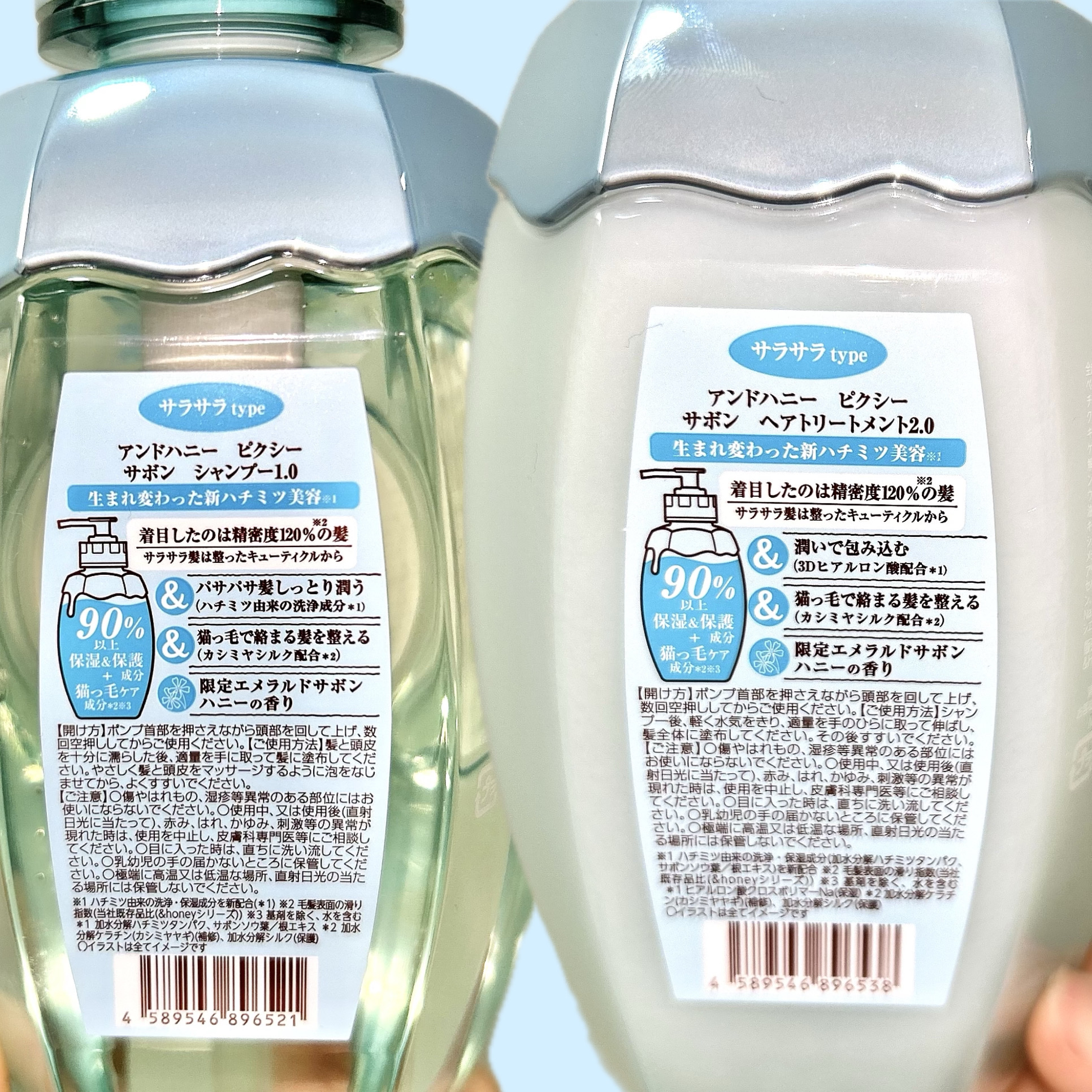 - 〈数量限定〉&honey サボン ピクシー ペアセット POINT1 SEASONALITY ハチミツ美容ヘッドスパ これからの汗ばむ季節にぴったりのヘッドスパ効果。スッキリ洗いながらハチミツ*1の力でうるおう髪へ。 POINT2 FRAGRANCE 限定エメラルドサボンの香り イタリア産カミツレ花油*2とハチミツ*1を配合。 清潔感あふれる優しい香りが広がります。 POINT3 DESIGN イラストレーター平野瑞恵氏を起用 コスメや書籍など幅広いデザインを手がけている人気のイラストレーターを採用。水彩画テイストのデザイン。 〈セット内容〉 シャンプー本体1個、ヘアトリートメント本体1個、ピクシー4STEPお試し1個入り *1 保湿 *2 香気・保湿