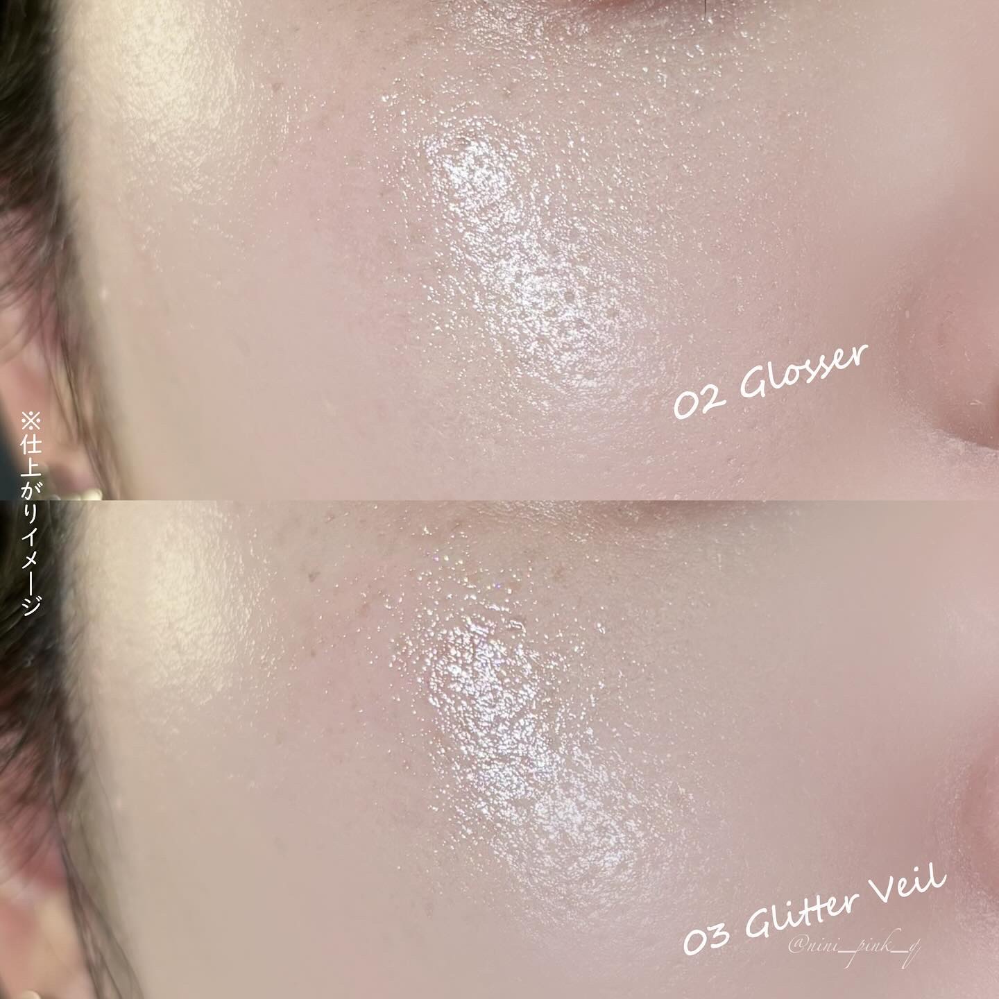 今年私がハマったブランド、Glintグリントです!キラキラ系コスメに特化してて、もう全てが可愛いし輝きが美しい〜!! リキッドハイライターは前回のメガ割で購入しました!1本買うとなんと01番のハイライターが付いてくる、というとんでもサービスだったので1664円で02番を買って2本ゲットしました! リキッドならではのジュワッとした光沢感がたまらないです♡ 01番は艶やかなゴールドベージュの輝きが美しい!