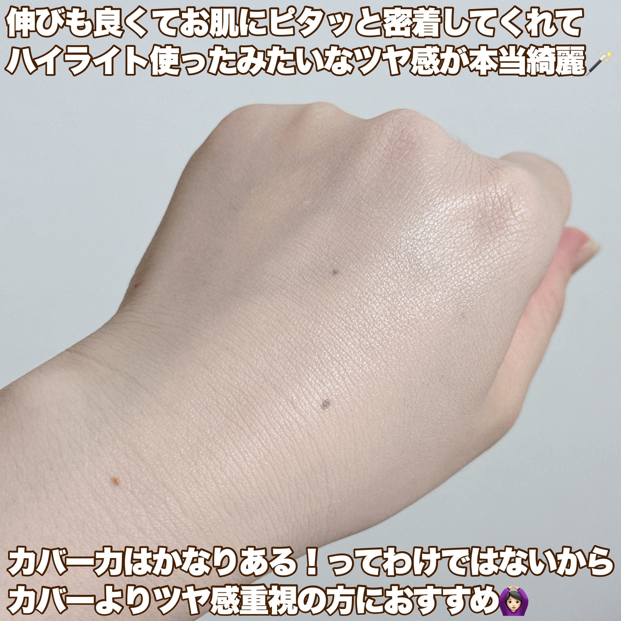 自然なうる艶感で透明感のあるお肌を演出してくれます。 スキンケア並みのエッセンス62%配合、さらにグルタチオン成分も配合されています。 着け心地が軽く、時間が経っても乾燥で崩れにくいような気がします。