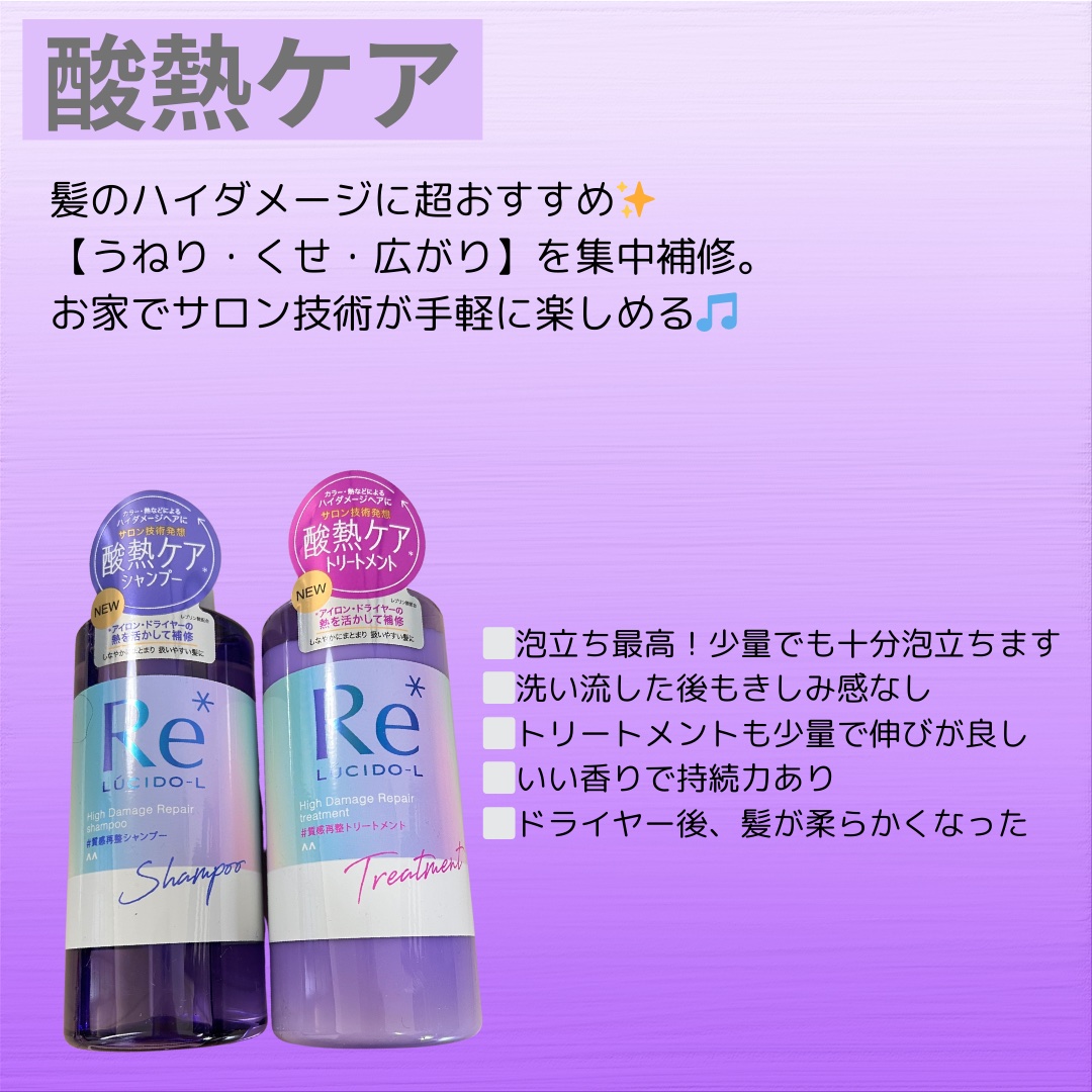 - <シャンプー> もちもちの泡で摩擦ダメージを抑え、きしみ・引っ掛かりのない操作性で傷んだ髪をなめらかに洗い上げる酸熱ケアシャンプー。ドライヤーやヘアアイロンの熱を活かしてうねり・くせ・広がり等のハイダメージ毛をまとまるツヤ髪に導きます。 〇キンモクセイ×グレープフルーツの香り 〇酸熱トリートメント成分*1配合 〇ヒートリペア成分2*配合 〇カラーキープ成分*3配合 〇アミノ酸系洗浄成分配合 〇ラウレス硫酸塩フリー 〇パラベンフリー <トリートメント> 傷んだ髪に密着し髪の内・外部を補修。ダメージでパサつく髪にうるおいのある保湿感が持続する酸熱ケアトリートメント。ドライヤーやヘアアイロンの熱を活かして、うねり・くせ・広がり等のハイダメージ毛をまとまるツヤ髪に導きます。 〇キンモクセイ×グレープフルーツの香り 〇酸熱トリートメント成分*1配合 〇ヒートリペア成分*2配合 〇潤いキープ成分*4配合 〇パラベンフリー *1レブリン酸(毛髪補修) *2メドウフォーム-δ-ラクトン *3リンゴ酸ジイソステアリル(毛髪保護) *4ラウロイルグルタミン酸ジ(フィトステリル/オクチルドデシル)
