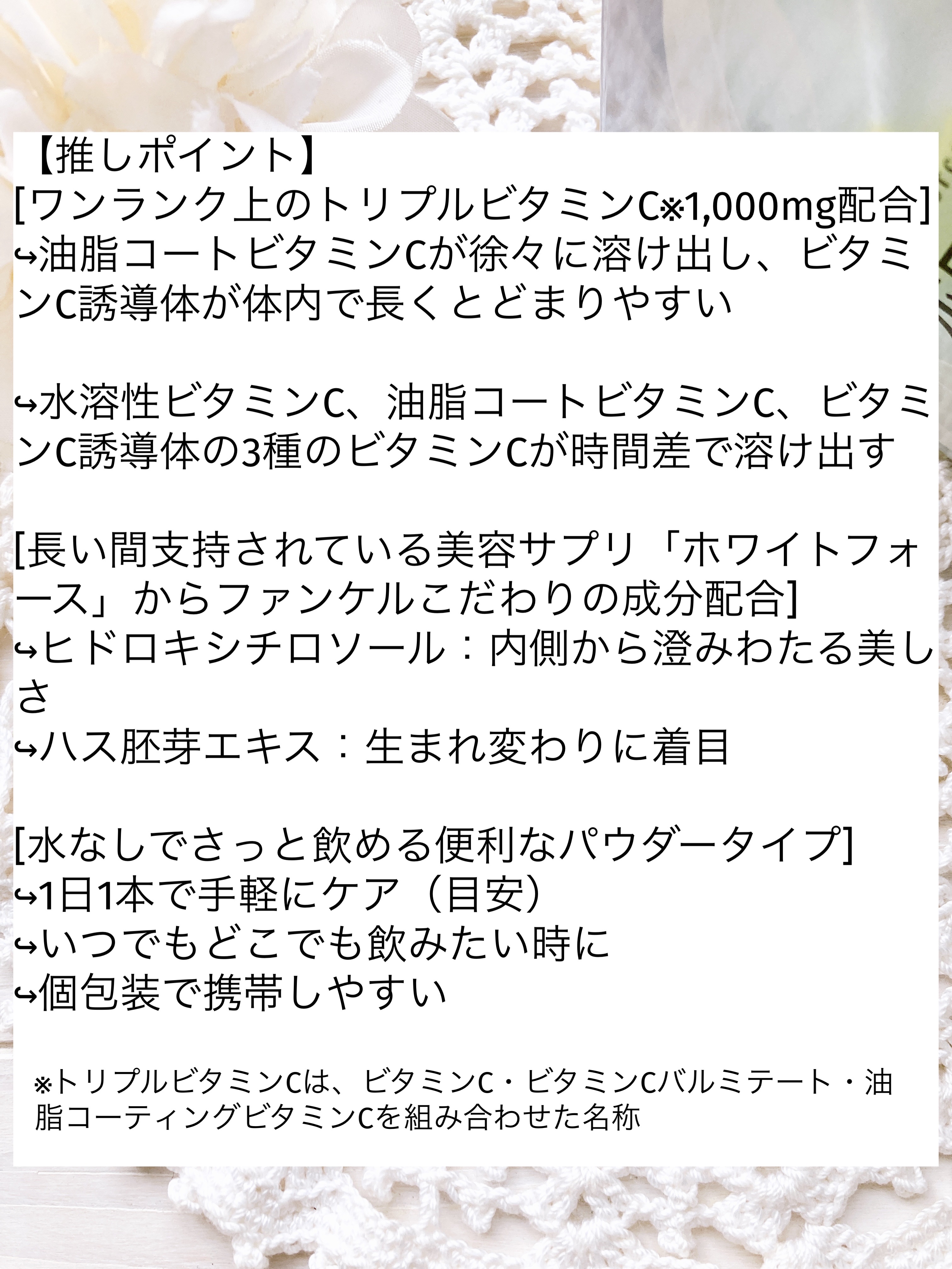 ファンケルさまからいただきました🫧ˊ˗FANCLホワイトフォースCパウダーレモン&グレープフルーツ風味ファンケルの元々あるサプリメントホワイトフォーカスにトリプルビタミンC*を1,000mg配合したパウダーが待望の定番化🌸ビタミンCは体内に留...