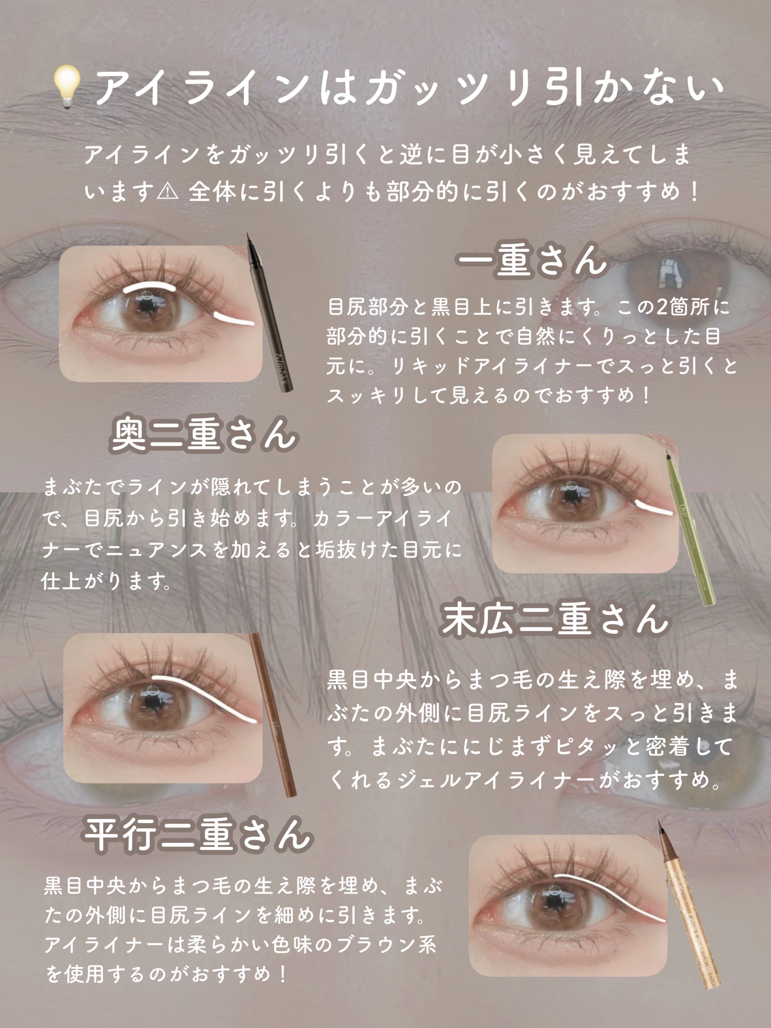 ベースメイクの順番はファンデーションの種類によっても違うのですが、 アイメイクはアイシャドウ→ビューラー→アイライン→マスカラという順番で行います。 アイメイクとのバランスを考えながら、どのリップを塗るかを決めます。 パウダーチークとクリームチークがありますが、クリームチークはムラになりやすいので初心者さんはパウダーがいいかも🙆♀️ ベースメイクの最後でもOKですが、全体のバランスを見ながら入れることでシェーディングが濃くなりすぎたりハイライトを付けすぎるなどの失敗が少なくなります。