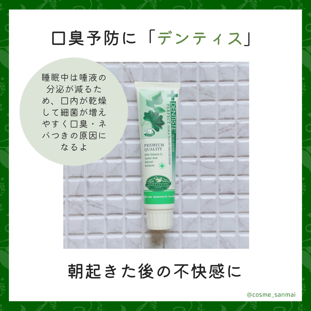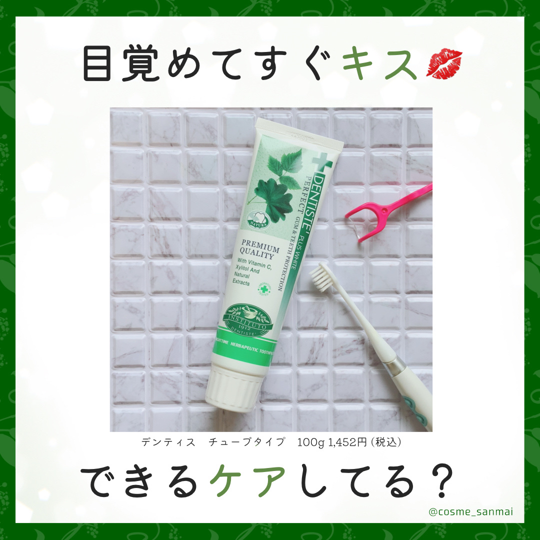 - 目覚めてすぐKissできる 恋する♡ハミガキ 「デンティス」は、口臭予防のできる歯磨き粉です。長時間息スッキリ! ■口臭の元を洗い流し、爽やかな息*1へ ニオイの原因となる成分を吸着除去するとされる「シクロデキストリン」*2配合。 オリジナルミントフレーバー*3がイヤなニオイや苦み成分をマスキングして爽やかな息に導きます。 また、口臭の元である汚れを洗い流し、ブラッシング後の口臭を防ぎます。 ■植物エキス*4で口内を潤す 数種類の植物エキス*4により、口内を潤し口臭予防をサポートします。 *1:マスキング効果 *2:吸着剤 *3:香料 *4:ミルラエキス、ラタニアエキス、セージ葉エキス、カミツレ花エキス、ウイキョウ果実エキス、アセンヤクノキエキス、アニス果実エキス、カンゾウ根エキス、カシア樹脂エキス(保湿剤)