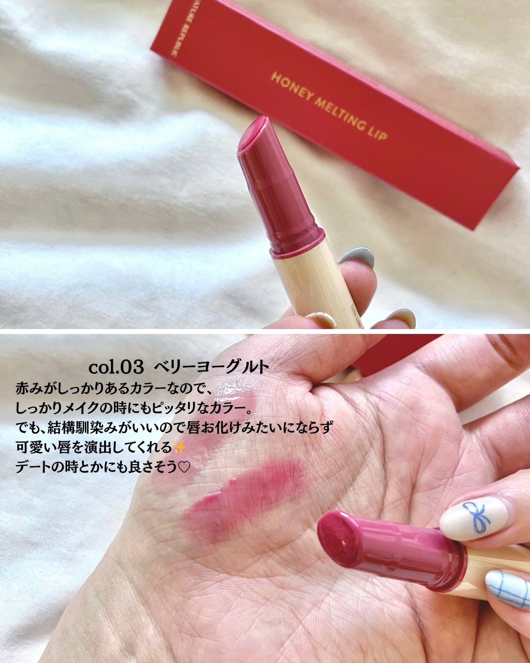 色持ちも保湿もコスパも完璧ですが、ぴりぴり感じたり、痛いところもあるかもしれませんので、敏感肌の方は要注意でございますわよ。 ネイチャーリパブリック ハニーメルティングリップ 11シースルーピンク 12シースルーグレー 13オーロラグリッター #韓国コスメ #ツヤリップ #韓国リップ #プランパー #リップバーム #新作コスメ #コスメ
