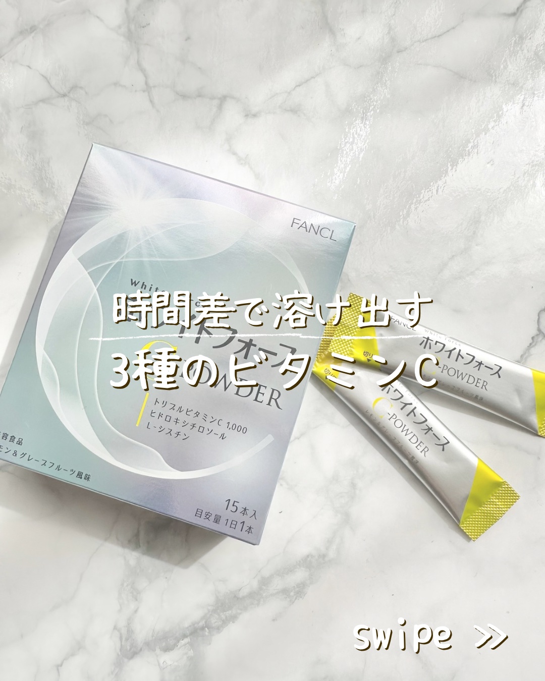 - 数量限定発売 ◆「トリプルビタミンC」を1,000mg配合 「トリプルビタミンC」は、体内に長く留まるビタミンC誘導体など、溶解性の異なる3種のビタミンCを配合しています。 汗などでビタミンCの失われやすい、夏の時期にも◎。 ほかにも「ヒドロキシチロソール」と「L-シスチン」「ハス胚芽エキス」を配合し、透明感のある美しい毎日をサポートします。 ◆爽やかなレモン&グレープフルーツ風味 水なしでそのまま飲めるパウダータイプのため、いつでもどこでも手軽にお召し上がりいただけます。 【1日の目安】 1本 【アレルゲン(28品目中)】 乳 【ご注意】 ※妊娠・授乳中の方、お子様はお召し上がりにならないでください。 ※2025年2月後半以降、商品パッケージリニューアル。