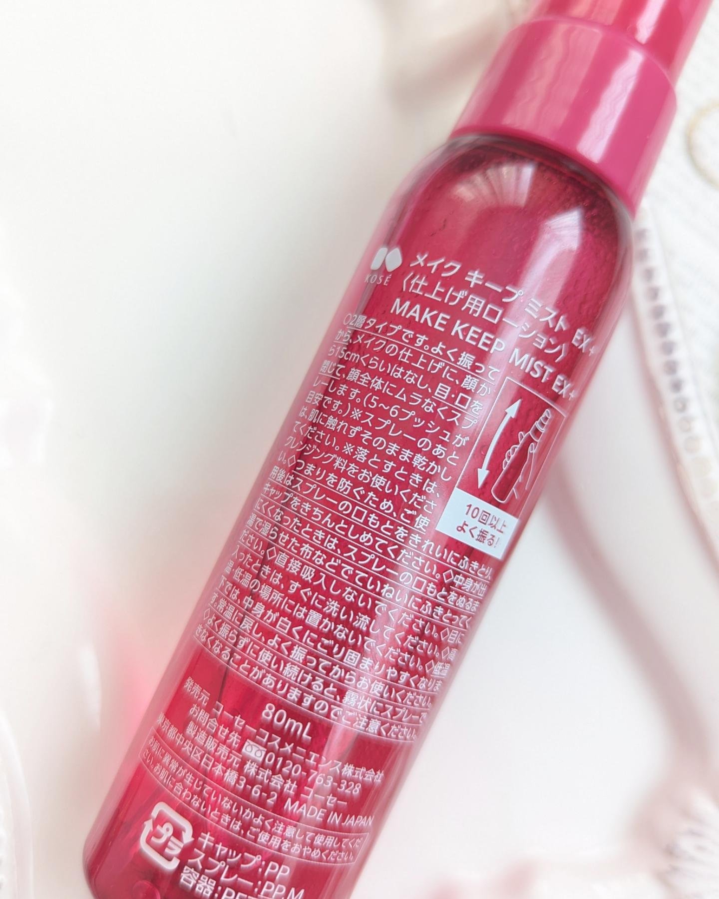 - メイク キープ ミスト EX + 長時間、化粧持ちデータ取得済み! ※当社調べ。個人差があります。 ●メイクの仕上げにシュッと吹きかけるだけで、蒸し暑い環境でも化粧くずれしにくくなるメイクキープミストです。 ●メイクよれ防止効果がプラスとなり、メイクキープ効果が衝撃パワーアップ! コーセーオリジナルの「スーパーメイクコート成分」を新配合。 表情の動きにもよれにくく高い柔軟性をもつため、 表情の変化によるメイクよれを防止。 美しい仕上がりをキープします。 ●スーパーウォータープルーフヘパワーアップ! 汗・水・涙にも強く、撥水効果を発揮します。 撥水性の高い膜が、 隙間なく均一に肌へ密着。 汗・ 水 ・ 涙をしっかりはじき、メイクくずれを防ぎます。 ●高い皮脂プルーフ効果で、 テカリ&毛穴落ち防止効果がパワーアップ! 皮脂テカリ・くずれ防止成分が皮脂をはじくと同時にテカリを防止。 テカリだけでなく、 メイクの毛穴落ちまで防ぎます。 ●高温多湿試験済み※! 蒸し暑い環境でもテカリやベタつきを防ぎ、 美しい仕上がりをキープします。 ※化粧もちに関して (コーセー調べ。 効果には個人差があります。) ●ふんわり細やかなミストが均一な1枚の膜を形成! つけたての美しいメイクを長時間キープ。 メイクをしっかり固定しながら、顔の動きに合わせて伸縮する膜を肌表面に形成。 時間が経ってもメイクがよれにくく、 美しい仕上がりが長時間持続します。 ●新配合のシカ成分をはじめとする数種の保湿成分を贅沢に配合! 肌にうるおいをあたえ、 乾燥を防ぎます。 マスク着用によるメイクのよれや、マスクへのメイク移りを防ぎます。 大気中の微粒子(ちり・ほこり・PM2.5など) からお肌をまもります。 ●アレルギーテスト済み ●ノンコメドジェニックテスト済み ※すべてのかたにアレルギーが起きない、コメド (ニキビのもと)ができないというわけではありません。 ジューシーフローラルの香り 無着色 ※スーパーメイクコート成分は(ジメチコン/ビニルトリメチルシロキシケイ酸)クロスポリマー、汗・皮脂プルーフ成分はトリメチルシロキシケイ酸、皮脂テカリ・くずれ防止成分は(ジメチコン/ビニルジメチコン)クロスポリマー、シカ成分はツボクサ葉エキス、ヒアルロン酸は加水分解ヒアルロン酸、コラーゲンは加水分解コラーゲンです。 <ご注意> 低温下では中身が白く固まりやすくなりますが、 常温に戻すために湯せんや電子レンジなどを使って高い温度で温めると品質が変化してしまいます。 さらには容器が変形・破損することで、やけどや怪我の恐れがあります。 大変危険ですので、湯せんや電子レンジなどを使って加熱することは絶対にお避けください。